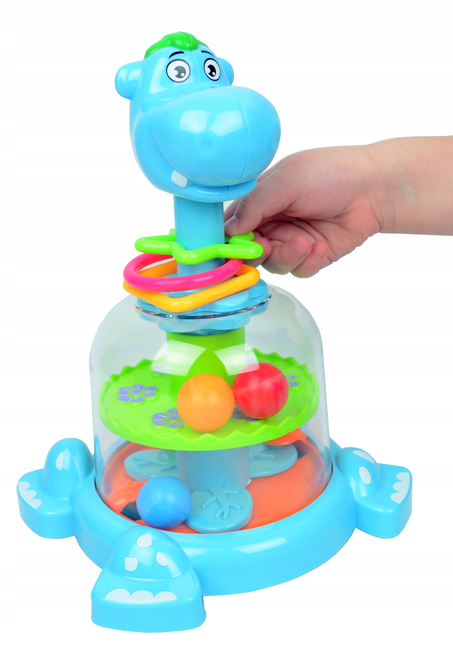 Дитина може торкнутися 3 барвистих ободів на шиї бегемота, обертати їх, рухатися вгору і вниз. Таким чином він вчиться викликати кольори та вивчати нові форми, які є колом, квадратами та зіркою . У прозорому животі Гіппії є два барвисті підлоги з мотивами листя та квітів. На кожному з них було розміщено дві кульки, всі в різних кольорах. Іграшка приймає живлення одним кроком! Все, що вам потрібно зробити, - це натиснути голову тварини з невеликою силою, і кульки всередині почнуть обертатися і стрибати. Це дуже просто , що змушує її наповнити дитину радістю!