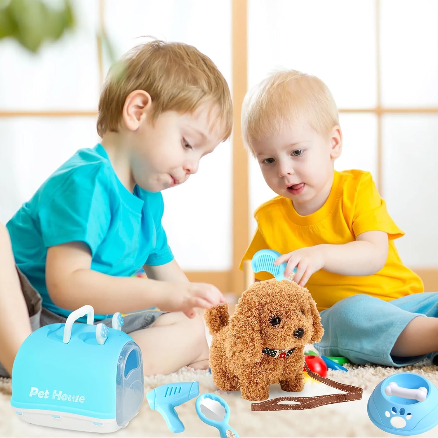 Іграшка містить аж 7 елементів, серед яких собака, миска, кістка, гребінець, дзеркало, фен. і практичний ящик для транспортування 🧺💙. Завдяки цьому ваш малюк може грати роль вихователя чи ветеринара та весело вчитися доглядати за тваринами!