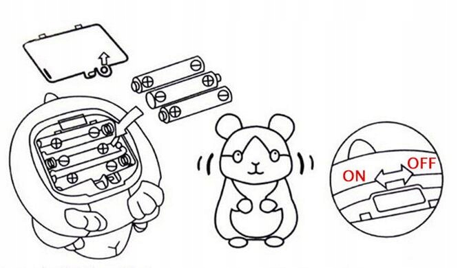 - Вставивши три батарейки типу ААА, увімкніть іграшку за допомогою перемикача ON/OFF, розташованого внизу.