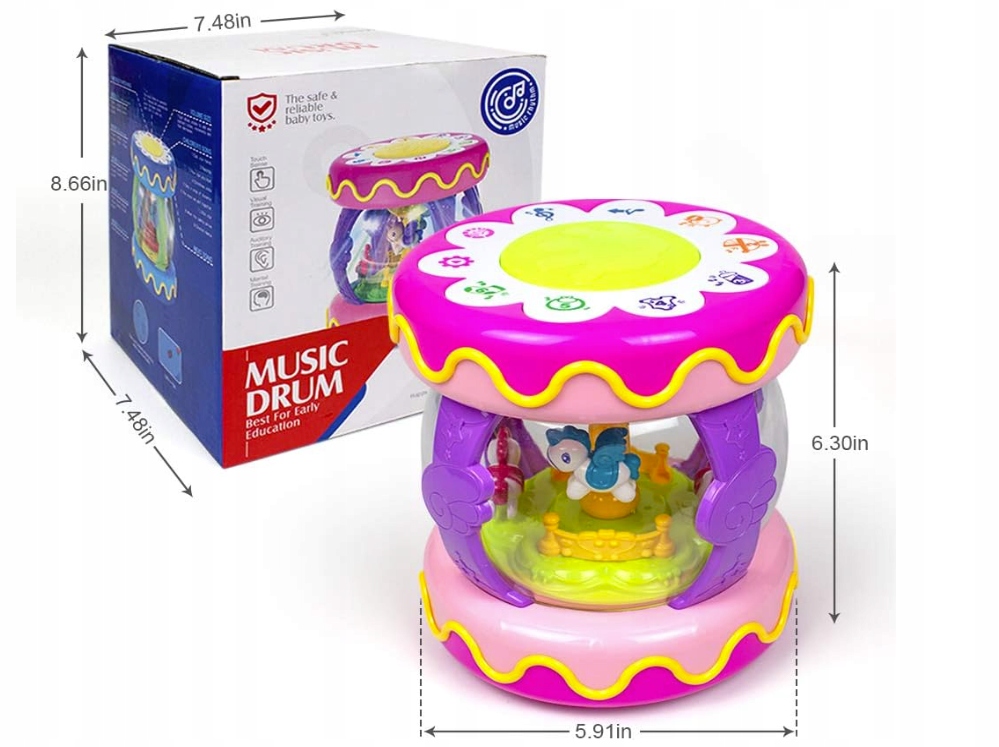 Безпечна конструкція: виготовлена з довговічного, неборужуючого абс, щоб забезпечити довгострокову продуктивність. Округлий край і гладка поверхня захищають шкіру дитини. Дно барабана оснащене шківами, які можуть обертатися в усіх напрямках, комфортно для того, щоб дитина грала та рухатись, заохочуйте дитину грати. Іграшки, можливо, розвивають музичний сенс малюка та ранні музичні знання. Музичні іграшки надихають мозок немовлят та дітей, розвиваючи музичну творчість, пам’ять, координацію сенсорної роботи.