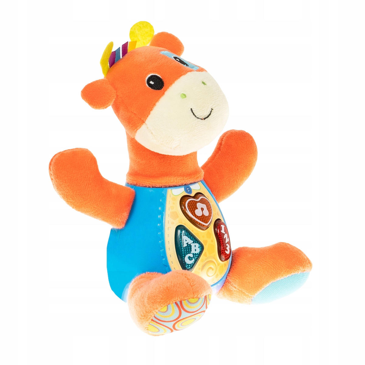 - На животі тварини є три кольорові функціональні кнопки, які активують різні мелодії та навчити дітей основним цифрам і буквам.
