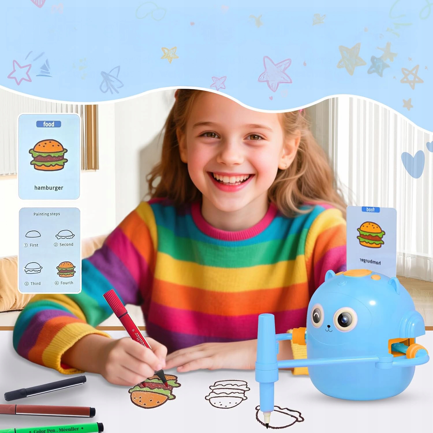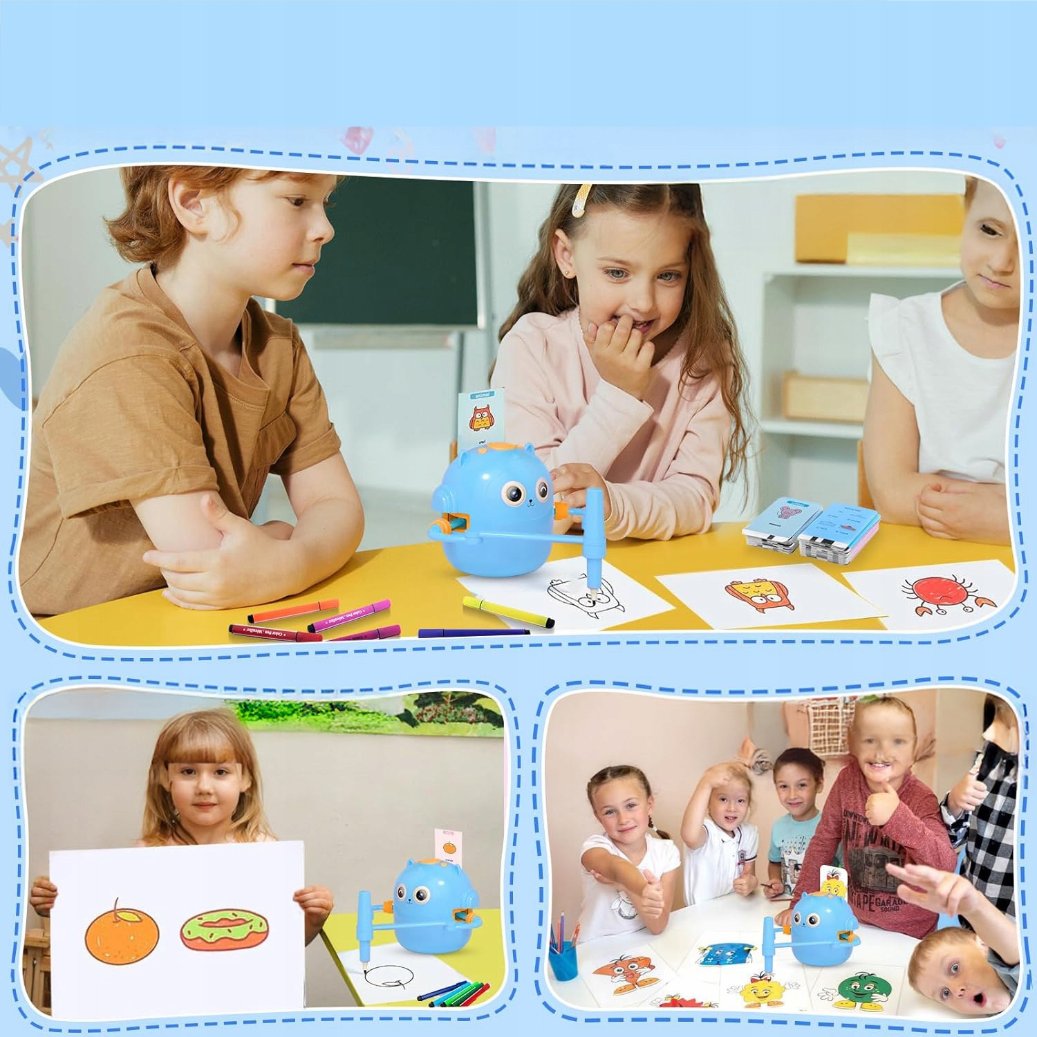 Цей дитячий робот для малювання є персоналізованим партнером для навчання. Завдяки вбудованій музиці та голосовій взаємодії малювання стає захоплюючим досвідом. У комплект входять 100 карток із різними дизайнами, як-от тварини, транспортні засоби, рослини тощо, що робить кожен день навчання веселим. Прості покрокові інструкції містяться на зворотному боці кожної картки, щоб допомогти маленьким дітям у процесі малювання.