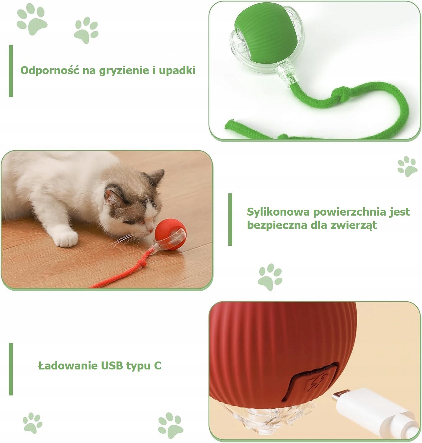 М’яч рухається у випадкових напрямках, вібрує та зачіпає тварина в активну гру, стимулюючи мисливський інстинкт.