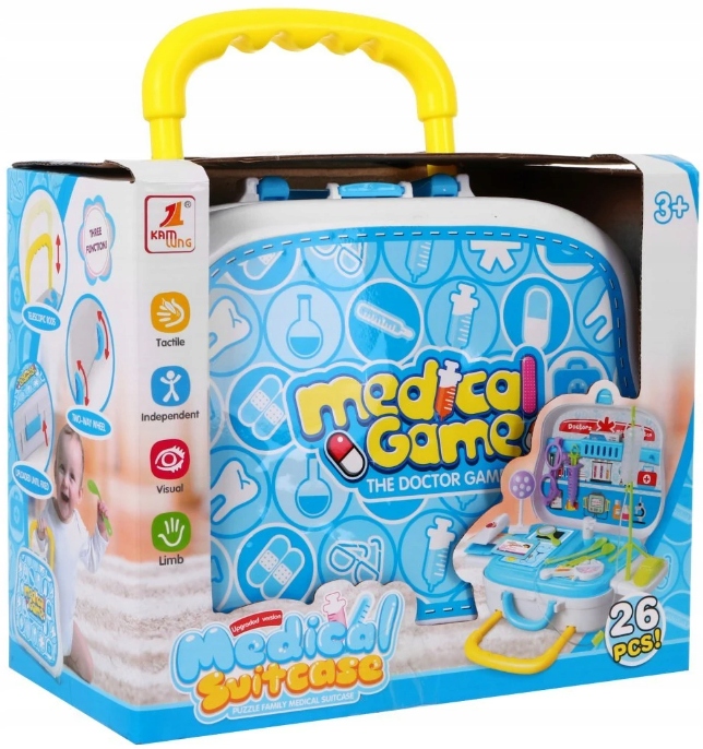 Барвиста медична аптечка закрита в практичній валізі. Ідеальний подарунок дітям від 3 років. У наборі аж 23 аксесуари, які є у кожного лікаря. У закритій валізі є маленькі колеса. Ручку можна витягнути ззаду для зручності перенесення.