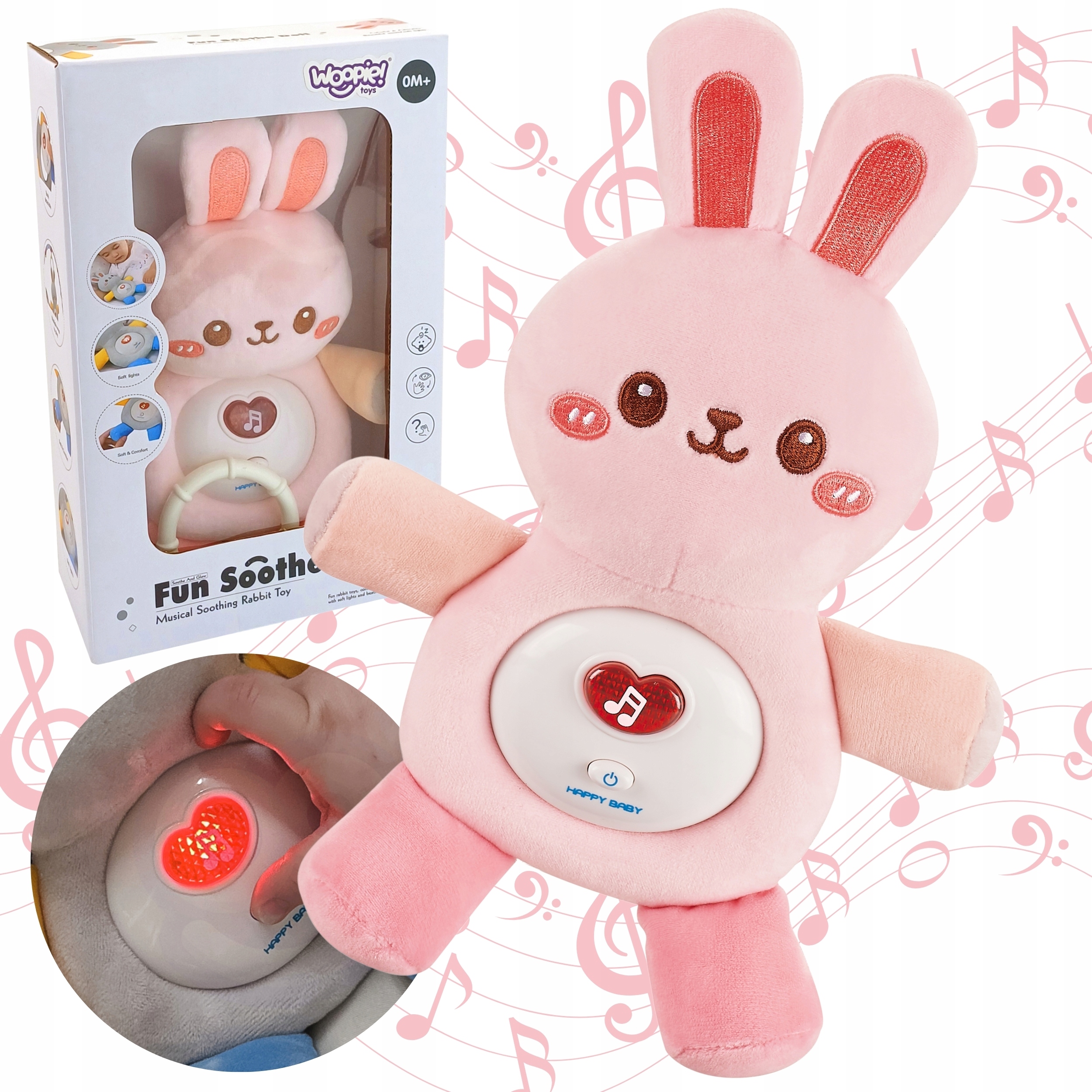 інтерактивний плюшевий рожевий зайчик заспокоїться і спить ваша дитина. іграшка має можливість увімкнути колиски для нашої маленької дитини, завдяки якому наш малюк не буде нудно з іграшкою. Цей м'який до сенсорного зайчика стане другом дитини з раннього віку. Крім того, плюш безпечно і можна очистити можна очистити (, видаливши механізм ), не турбуючись про будь -які пошкодження.