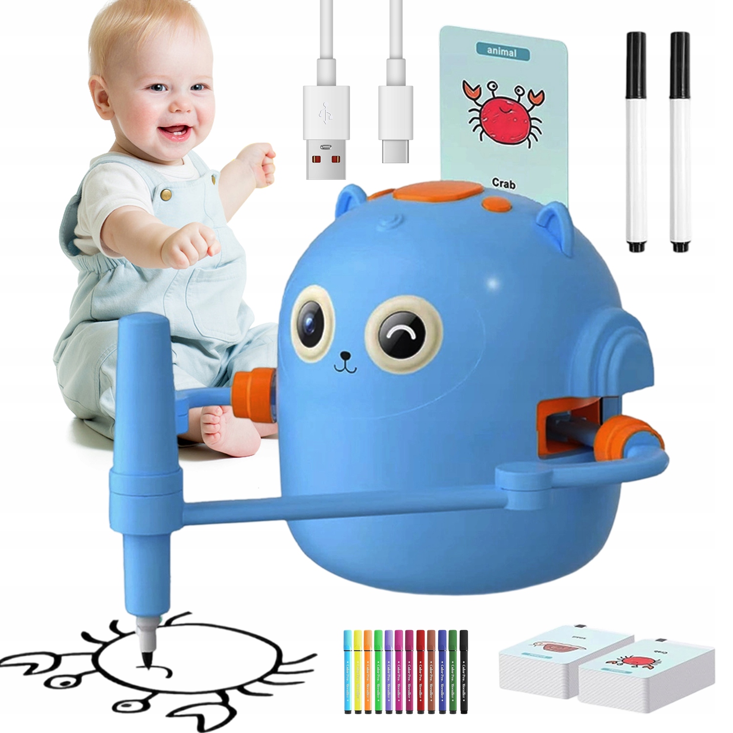 Робот має вбудовані музичні та голосові функції, завдяки яким малювання стає справжньою пригодою. Набір із 100 карток із зображеннями тварин, транспортних засобів і рослин, які щодня пропонують нові завдання. Кожна картка має прості покрокові інструкції, завдяки яким дітям легко навчитися малювати.