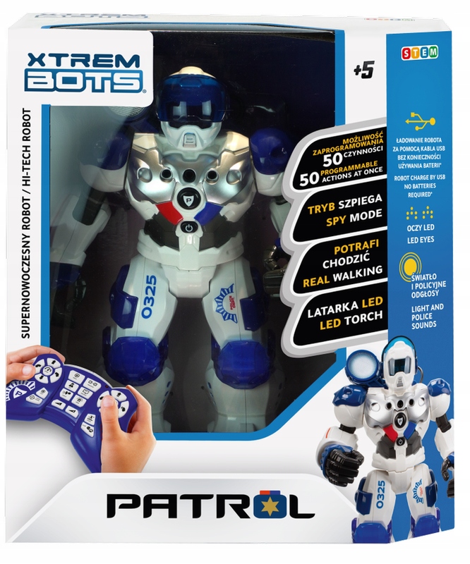 Patrol Bot — унікальний поліцейський робот, який може виконувати до 50 дій. Динамічний і технологічний дизайн з великим відбивачем на руці - не єдині переваги цієї футуристичної іграшки.Ваша дитина буде в захваті, коли Patrol Bot реагує і виражає емоції мімікою (очима) або починає видає справжні поліцейські звуки! b>Разом з дитиною запишіть звукове попередження та запустіть Patrol Bot у чат, і коли він почує тривожні звуки, він активується та відтворить запис. Це нескінченні можливості для розваг, які ніколи не набриднуть.У наборі є: керування контролером, функція шпигунства, понад 20 функцій, поліцейські звуки: сирена та стрілянина, світлодіодний прожектор. Комплектація: робот Patrol Bot, акумулятор LiPo 3,7 В, 600 мАг, інфрачервоний передавач, зарядний пристрій USB, посібник користувача.