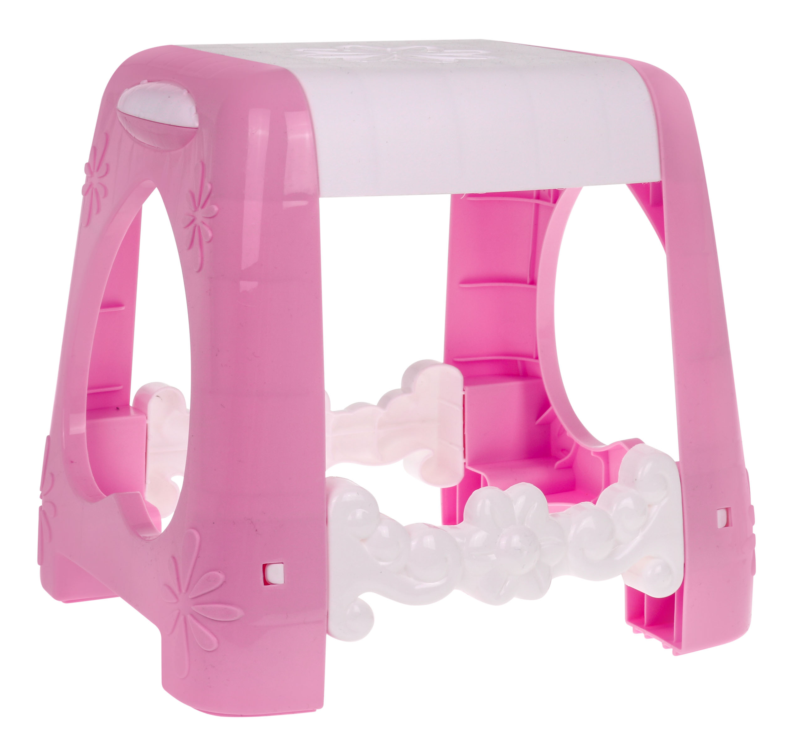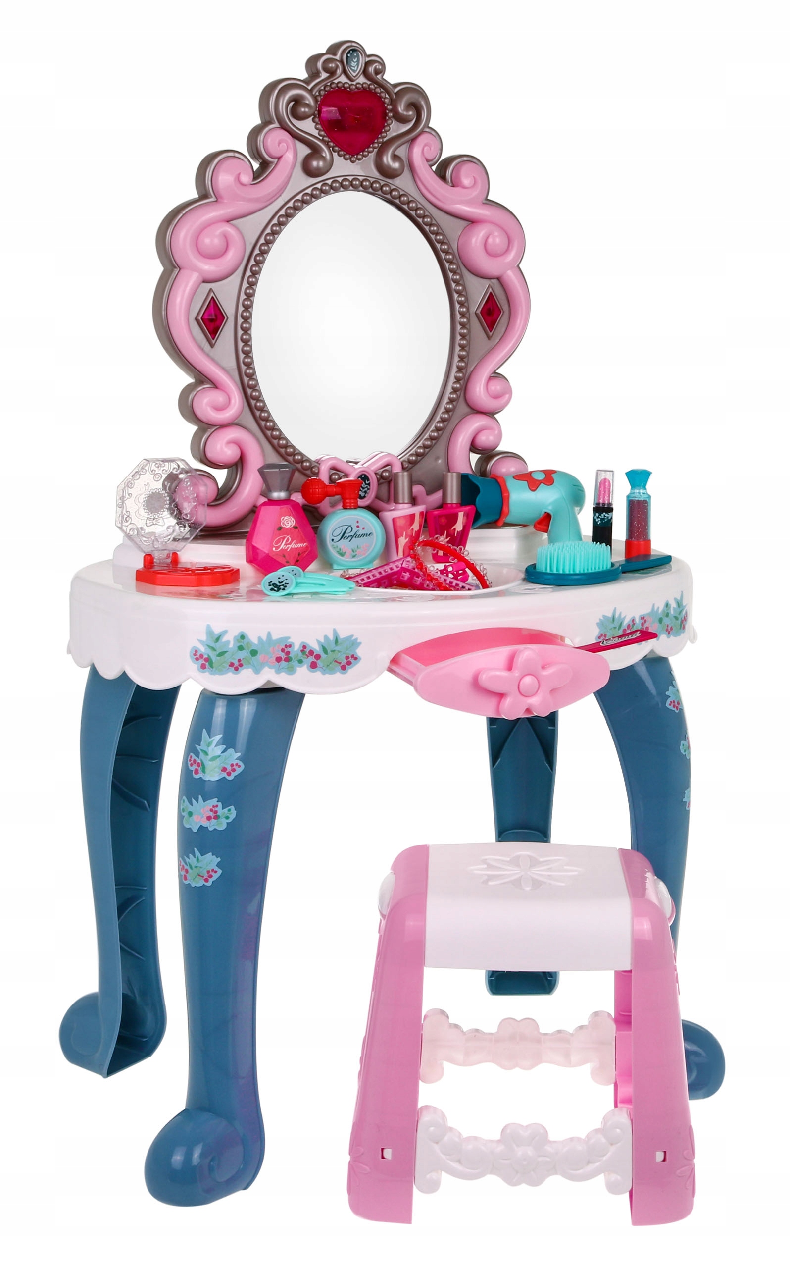 Інтерактивний туалетний столик з дзеркалом, табуретом і аксесуарами для маленької принцеси від трьох років. Іграшка має звукову (три мелодії) і світлову (сердечко над дзеркалом і два ромби з боків від дзеркала). Вся косметика, що входить в набір, є підробкою.