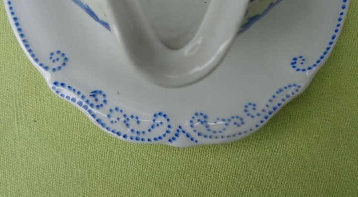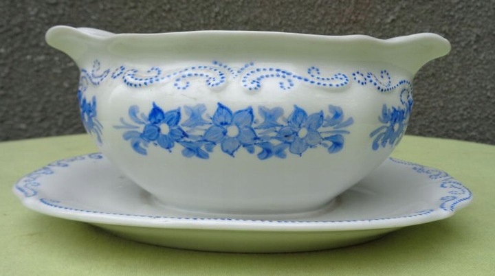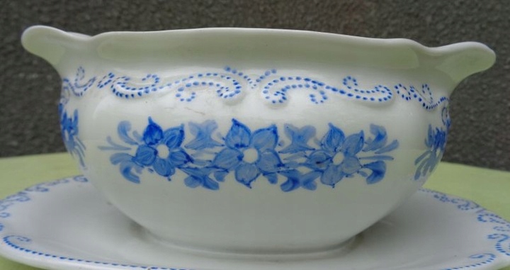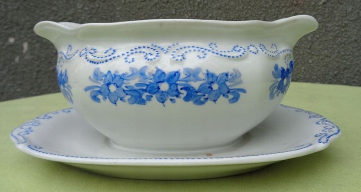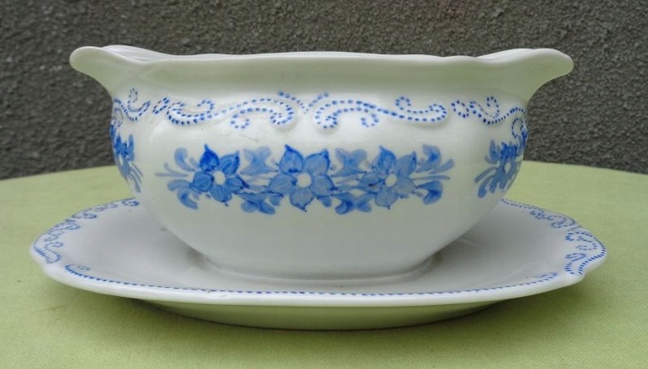Гарний, чистокровний, елегантний, розписаний вручну соусник, 1880-1900 рр. Експонат має красиву, елегантну, класичну форму та форму. Навіс експозиції в центральній частині прикрашений ручним розписом красивих синіх квітів. Верхня частина має крапковий орнамент, розписаний вручну. Край основи соусника також прикрашений крапковим орнаментом ручного розпису. Експонат підписаний, підпис видно на фото. Високоякісна порцеляна кольору слонової кістки. Порцеляна без пошкоджень. Рекомендую всім.