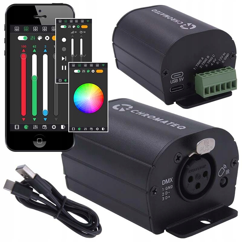 Chromateq Club 128 — це компактний ✅ портативний інтерфейс USB для сигналів DMX, що дозволяє керувати освітленням та сценічні ефекти з нашого ноутбука або комп'ютера. Ми також можемо запрограмувати DMX контролер і використовувати його в мобільній роботі. Це ідеальне рішення для виробників освітлення, ді-джеїв, гуртів і організаційних компаній, що забезпечує повний контроль над тим, що що відбувається на сцені.