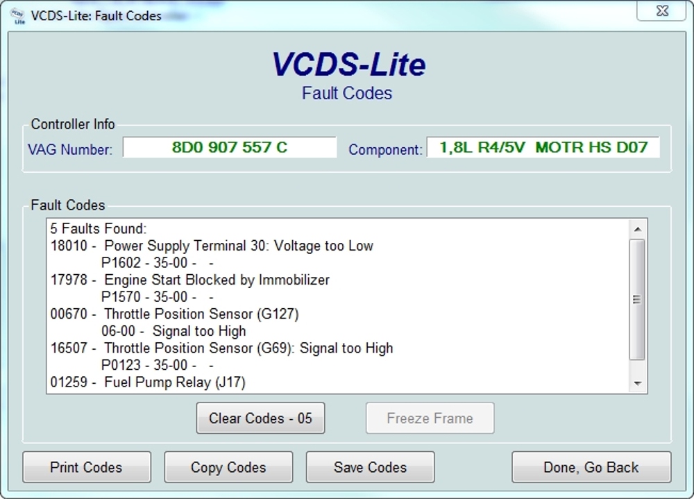 Інтерфейс дозволяє повну діагностику всіх модулів. Коди помилок відображаються з описом, наприклад, "0306 Циліндр 6 запалювання - пропуск запалювання"