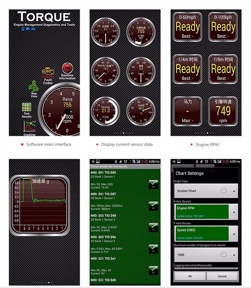 - Функції: Читання та видалення помилок OBD2, параметри моніторингу двигуна в режимі реального часу, видалення контрольного двигуна, видалення контрольного двигуна, видалення контрольного двигуна, вимірювання потужності двигуна (HP), прочитання на основі, попередній перегляд замерзних рамок (Freeze рамки) та інші.