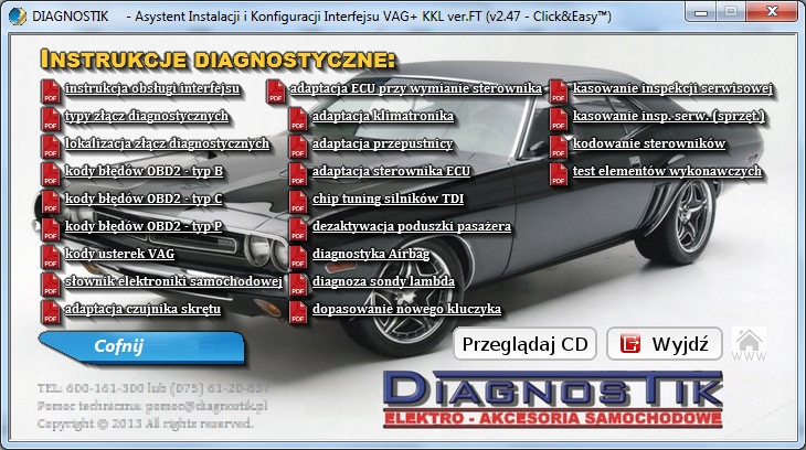 (інструкції, розташування діагностичних роз’ємів в окремих автомобілях, поради щодо діагностики, зокрема: видалення індикаторів обслуговування та перевірки масла, коди помилок.) і наша власна програма: Device Installation and Configuration Assistant версії 2.47 із Click&Easy™
