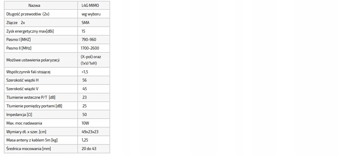 L4G MIMO / 15 dBi - набір з двох багатодіапазонних антен для стільникової передачі даних. L4G MIMO призначений для роботи в режимі диверсифікованих каналів передачі та прийому. Працює в усіх поточних і майбутніх мережах у Польщі та Європі.