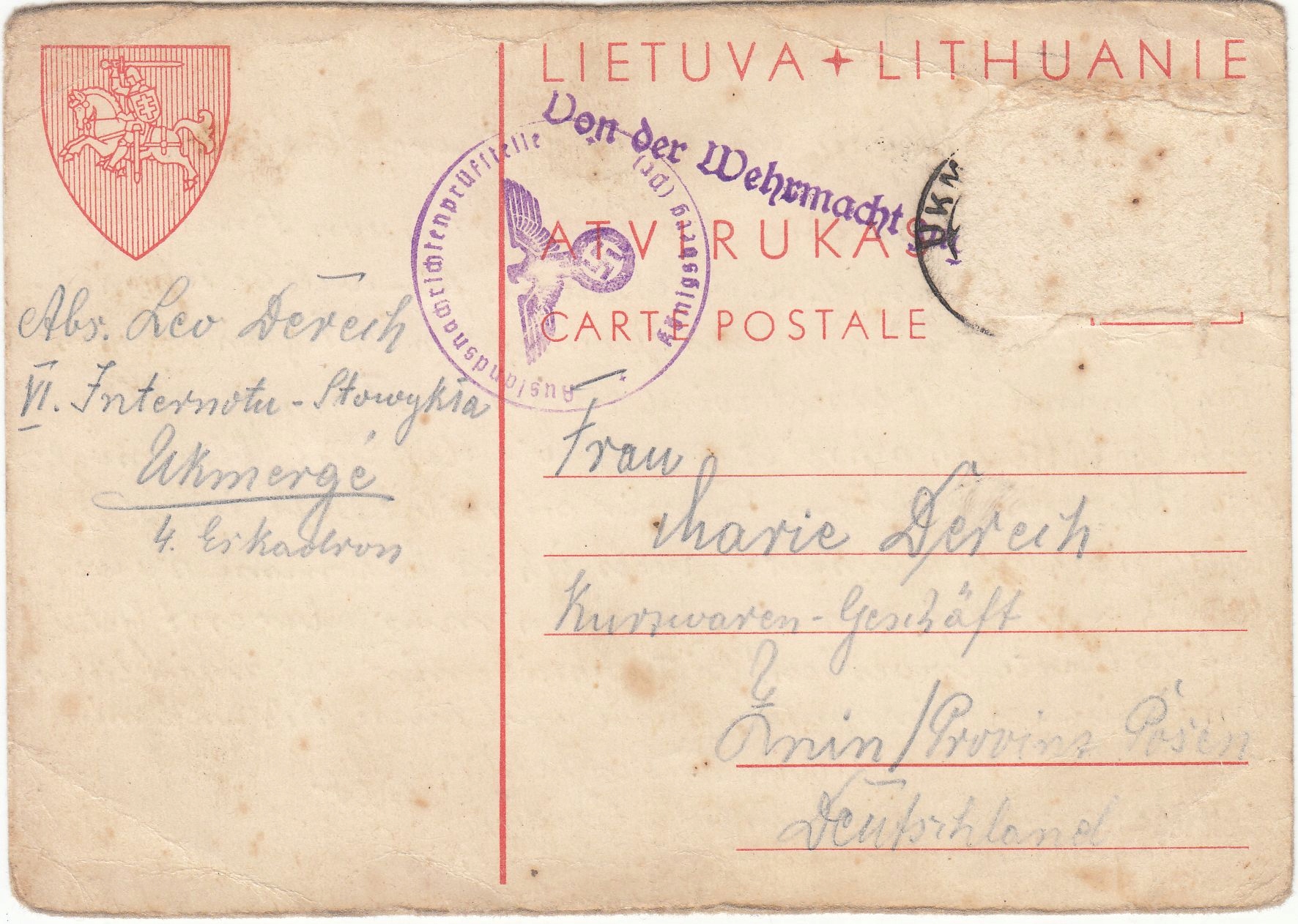 картка, надіслана з табору для інтернованих солдатів у Литві з Укмерге Вілкомієра до żnin. Нацистський Рейх 17 вересня 1939 р. Польські підрозділи армії, що працюють у східних районах Другої польської республіки, перетинали кордони з нейтральними сусідніми державами Балтії, а їхні солдати були інтернованими відповідно до міжнародного законодавства. , Близько 5000 людей були інтерновані в Литві і були встановлені в чотирьох таборах: у Вількомієрсі, у фортеці Форт проти Фортеці Каунас, у Калварії поблизу Вільнюса та Вілковіїшського. >