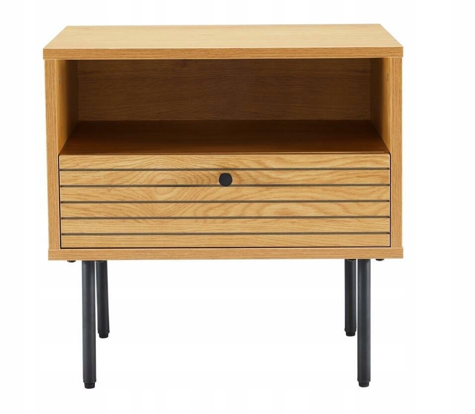 Кабінет і корпус Forns виготовлені з довговічного МДФ, який був прикрашений шпоном, що імітує дубовий шпон. Фронти ящиків із цікавим злитого горизонтального візерунка виглядає як ламела. Ящик оснащений чорною металевою ручкою. Мінімалістична ручка цікаво відповідає чорній металевій основі комода. Чорні ноги пофарбовані в порошок, щоб вони були стійкими до удару, наприклад при пилососі. Комод -комод був закінчений пластиковим колонтитом, щоб не допустити підлоги під меблею. Шафа вимагає встановлення розмірів картону: 62x48x14m