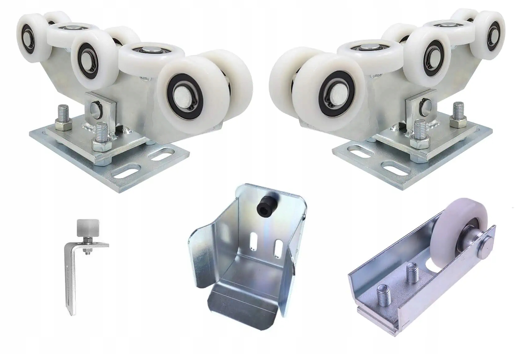 Повний набір для розсувних воріт Їзда на візку (два шматки) з 8 валиками, виготовленими з поліаміду (включаючи два горизонтальні валики). Віза гойдається і адаптується до розсувних воріт (вона з'єднана з основою зі стеблом). Він також має регулювання висоти з гвинтами. Він призначений для рейки 80x80x5 мм. Оцинкований продукт.