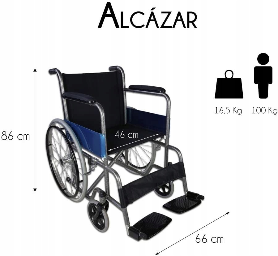 MOBICLINICAlcázarбазова сталева інвалідна коляска, що складається, характеризується міцною та довговічною конструкцією. Це гарантує постійну мобільність як вдома, так і на вулиці.