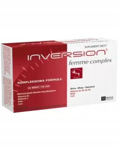 Інверсія Femme Complex - Дієтична добавка, уникаючи екстрактів із зеленого чаю та винограду, огіркової олії, риб’ячого жиру, бета -каротинового хряща, вітаміну С, В5 і В6, рибофавіну, біотину, цинку, селену, хрому, міді, заліза. Продукт, призначений для дорослих.
