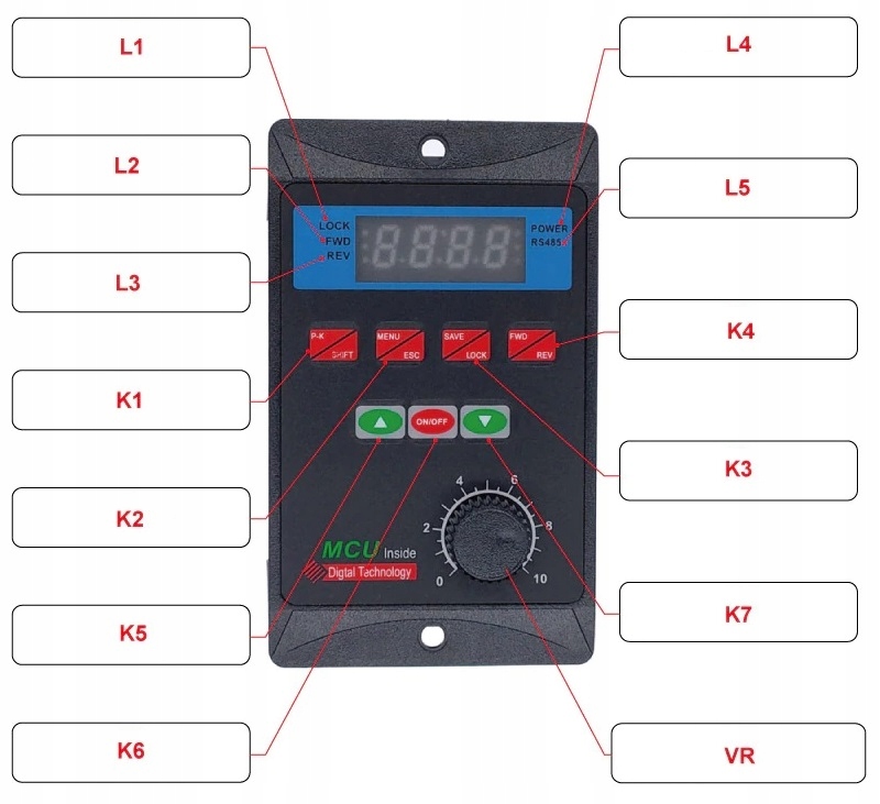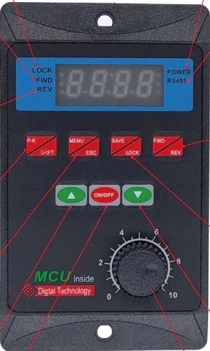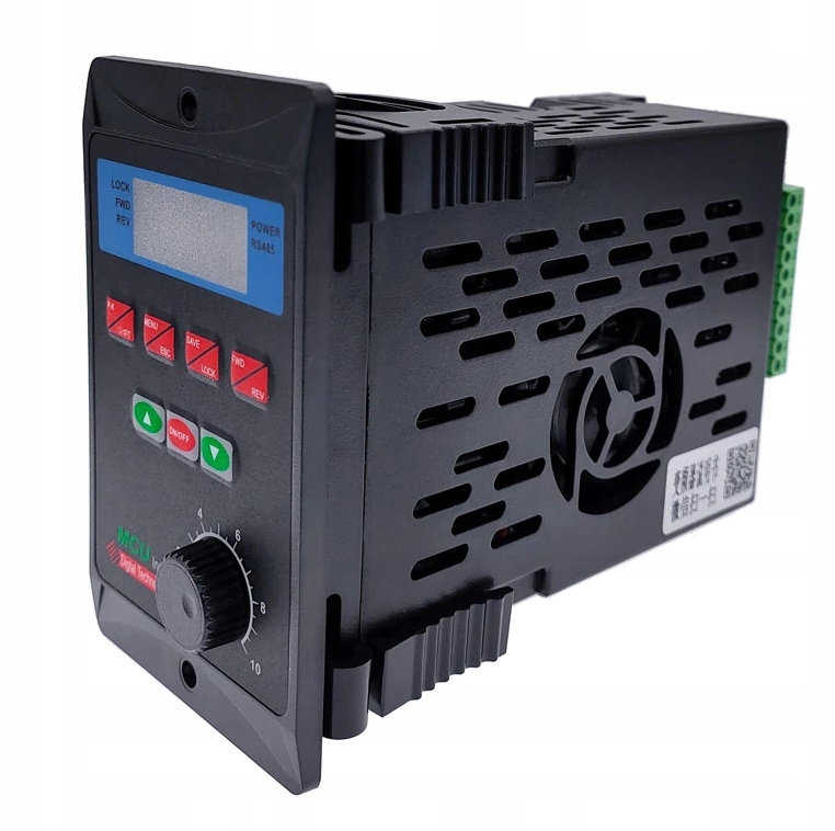 - Цифровий дисплей відображає основні параметри, швидкість обертання об/хв до зменшення, частоту, згенеровану для двигун в Гц, температура радіатора в інверторі, струм споживання в А, напруга в В.