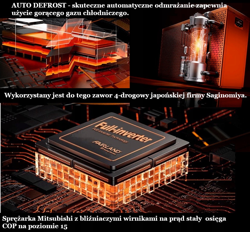 У насосах інвертора-плюс вони були відомі з високоякісного ротарі компресора з двома роторами постійного струму. Використання цих компресорів забезпечує високу ефективність та спокійну роботу. Через відсутність частого старту та постійної щоденної роботи з низькою швидкістю, ці компресори характеризуються надзвичайно довгим життям.