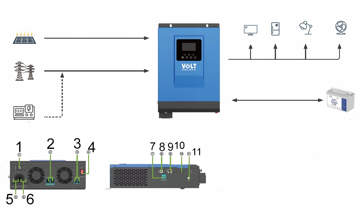 джерелом живлення. Завдяки цьому він може забезпечити індуктивні пристрої (включаючи електроінструменти, повітряні компресори, кондиціонери, холодильники, морозильні камери тощо) Gel VPRO Solar, глибокий цикл VPRO Solar або LifePO4.