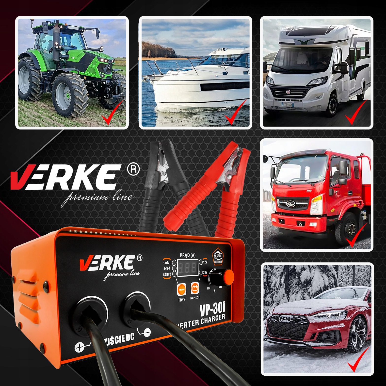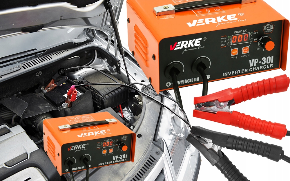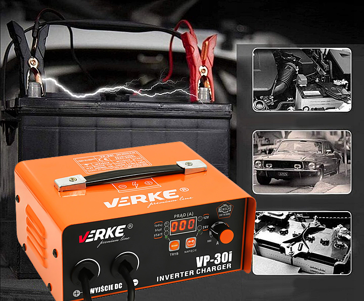 VP-30I - інверторний випрямляч для зарядки свинцево-кислотних акумуляторів 12 і 24В, з функцією запуску автомобіля з бензиновими та дизельними двигунами (включаючи мікроавтобуси, легкі вантажівки та тягачі).