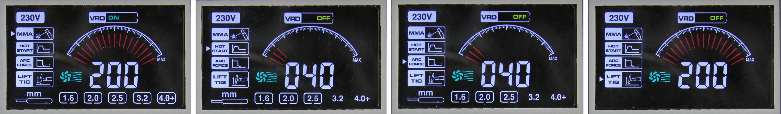 Наведений вище індикатор надає інформацію про рекомендовану товщину електрода для даного зварювального струму. Це підказка для початківців користувачів, після встановлення струму, що відповідає обраному електроду, рекомендовані корекції після випробувань на матеріалі.