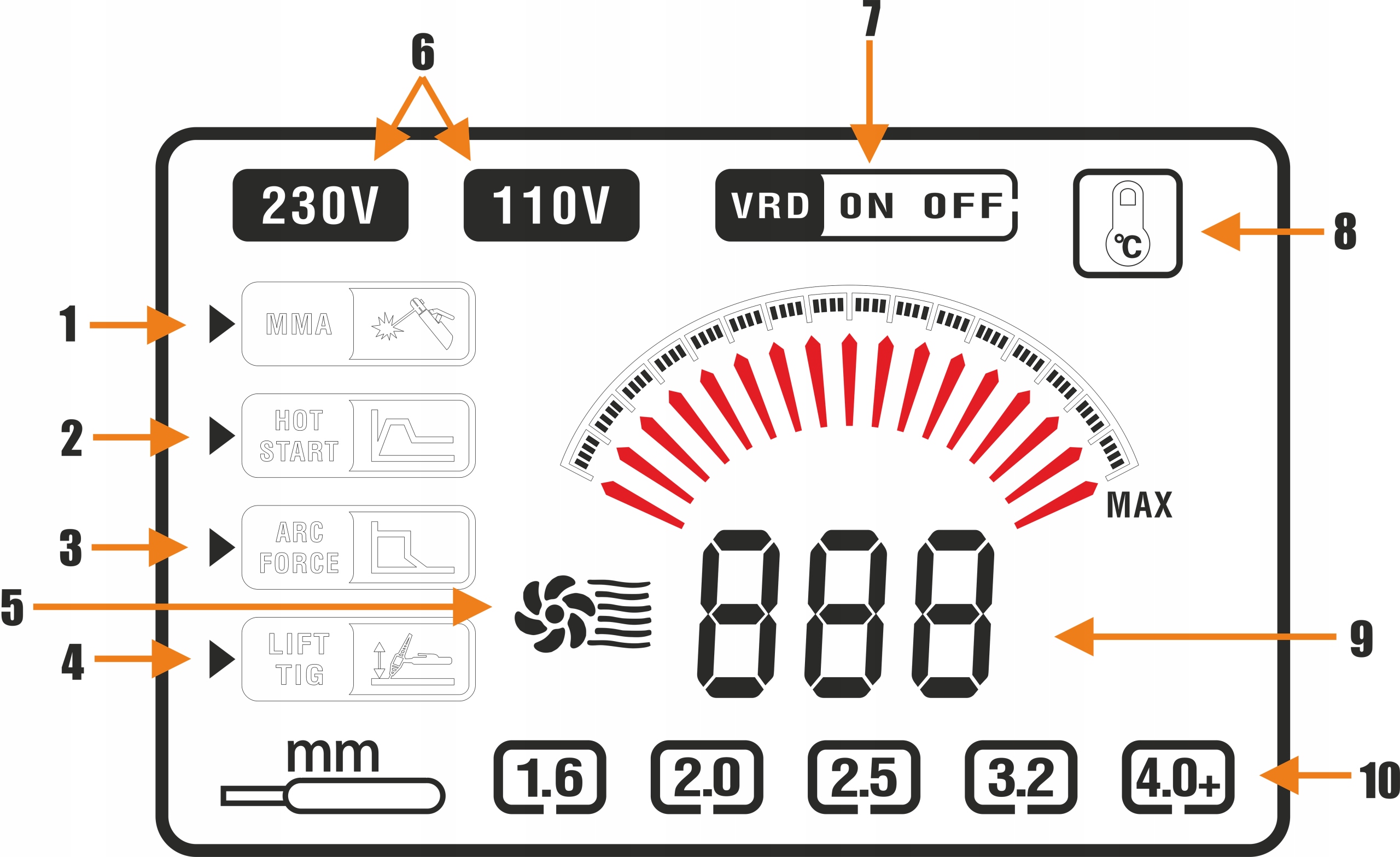 9. Цифровий дисплей, що показує налаштування потужності зварювального апарату