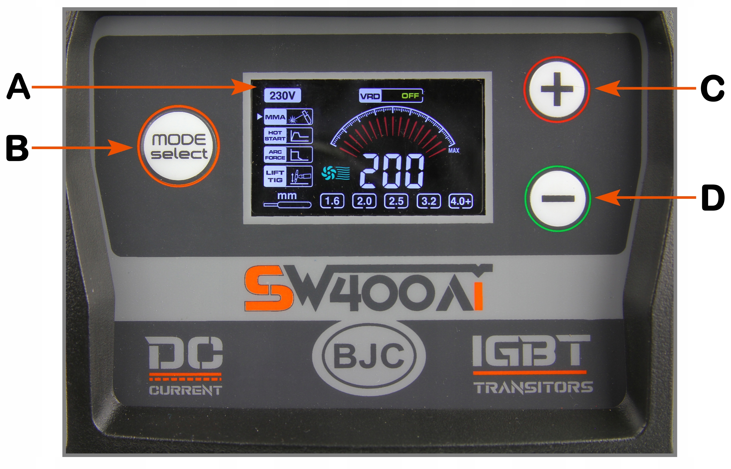 Зварювальний апарат BJC SW400Ai використовує систему VRD. Безпека зварника багато в чому залежить від функціональності використовуваного обладнання. Виробники зварювальних апаратів приділяють велике значення тому, щоб пропоновані ними пристрої забезпечували комфортну роботу та зводили ризик нещасних випадків до мінімуму. VRD – це система зниження напруги, завданням якої є відключення живлення протягом кількох мілісекунд після завершення зварювання. Ця функція також відповідає за зниження напруги на покритому електроді до безпечного рівня. Щоб увімкнути VRD, утримуйте кнопку вибору режиму (B)