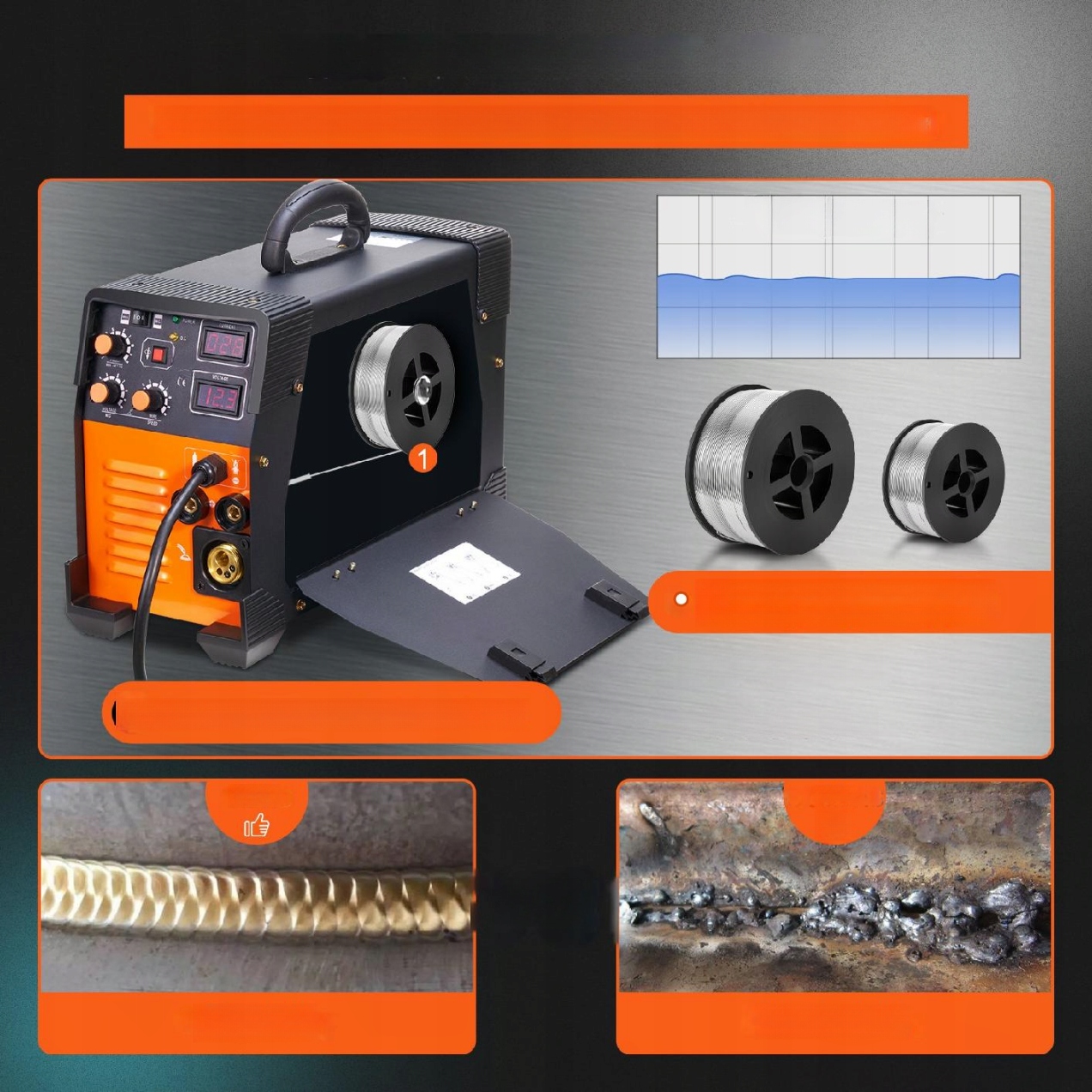 - ✅ Удосконалена система подачі флюсового дроту – автоматичний випуск захисного газу та чисті зварні шви.