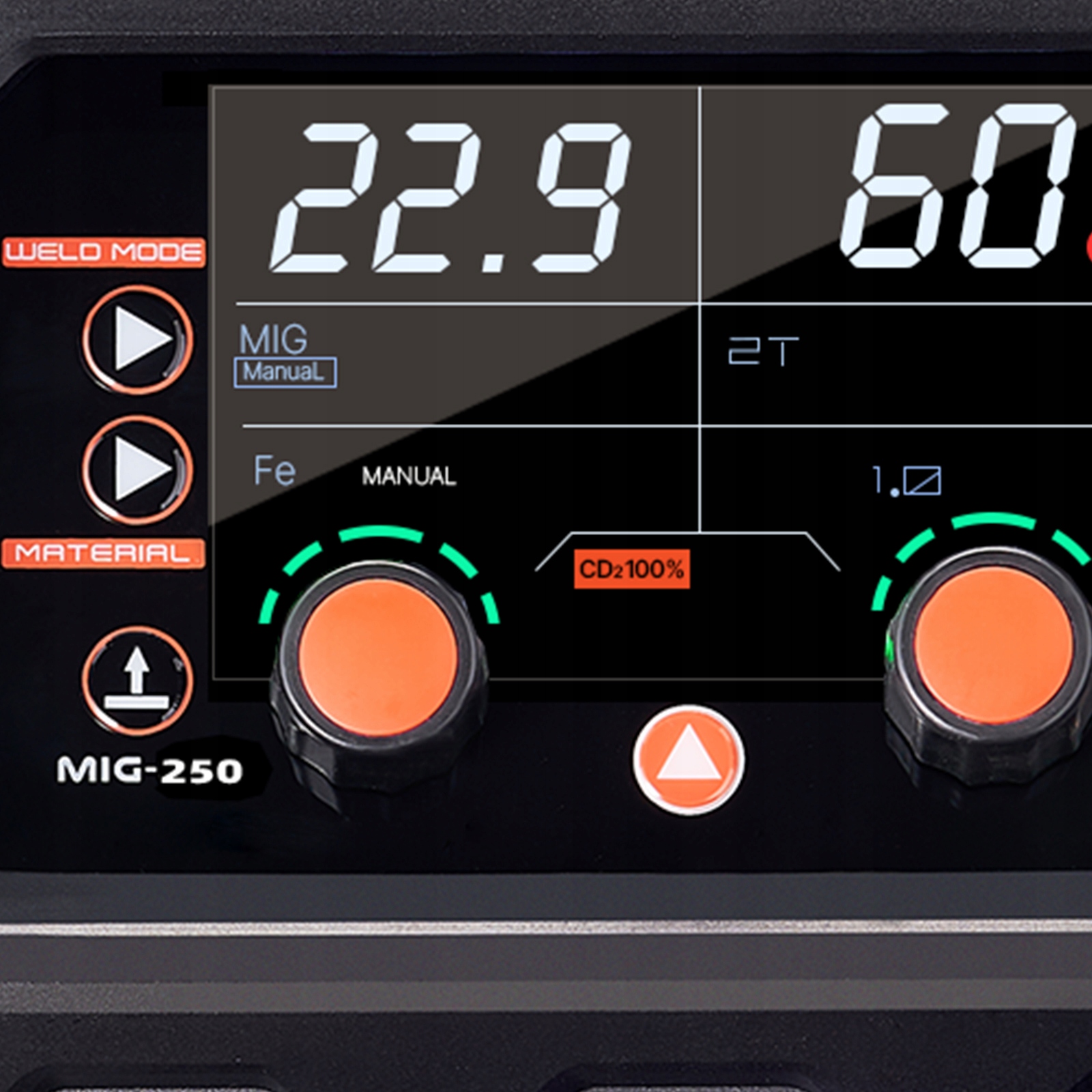 Апарат для зварювання MIG оснащений РК-екраном, який є чіткою та інтуїтивно зрозумілою панеллю керування, що дозволяє легко та точно налаштовувати параметри.