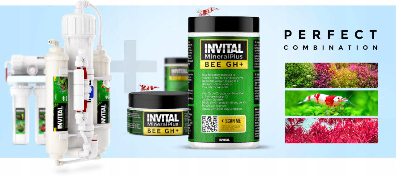 Бджолині та тигрові креветки роду Caridina потребують води з дуже низькою карбонатною жорсткістю KH і в той же час досить високою загальною жорсткістю. Таким чином, INVITAL Bee Mineral Plus GH лише збільшує GH, а не KH - креветкам потрібен, щоб цей показник був майже нульовим.