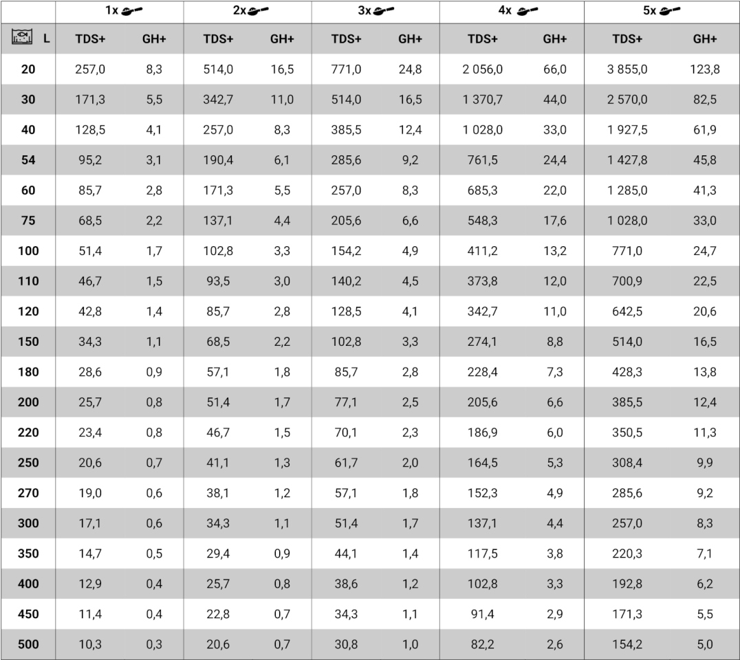 Відрегулюйте кількість плоських ложок (5,5 г) відповідно до параметрів, яких ви хочете досягти, та розміру акваріума (див. таблицю нижче). Можна дозувати безпосередньо в акваріум, але ми рекомендуємо розчинити дозу в 1 літрі води та розподілити по акваріуму. Короткочасне помутніння води зникне природним шляхом протягом декількох хвилин. Зберігати в щільно закритій тарі в сухому і темному місці.