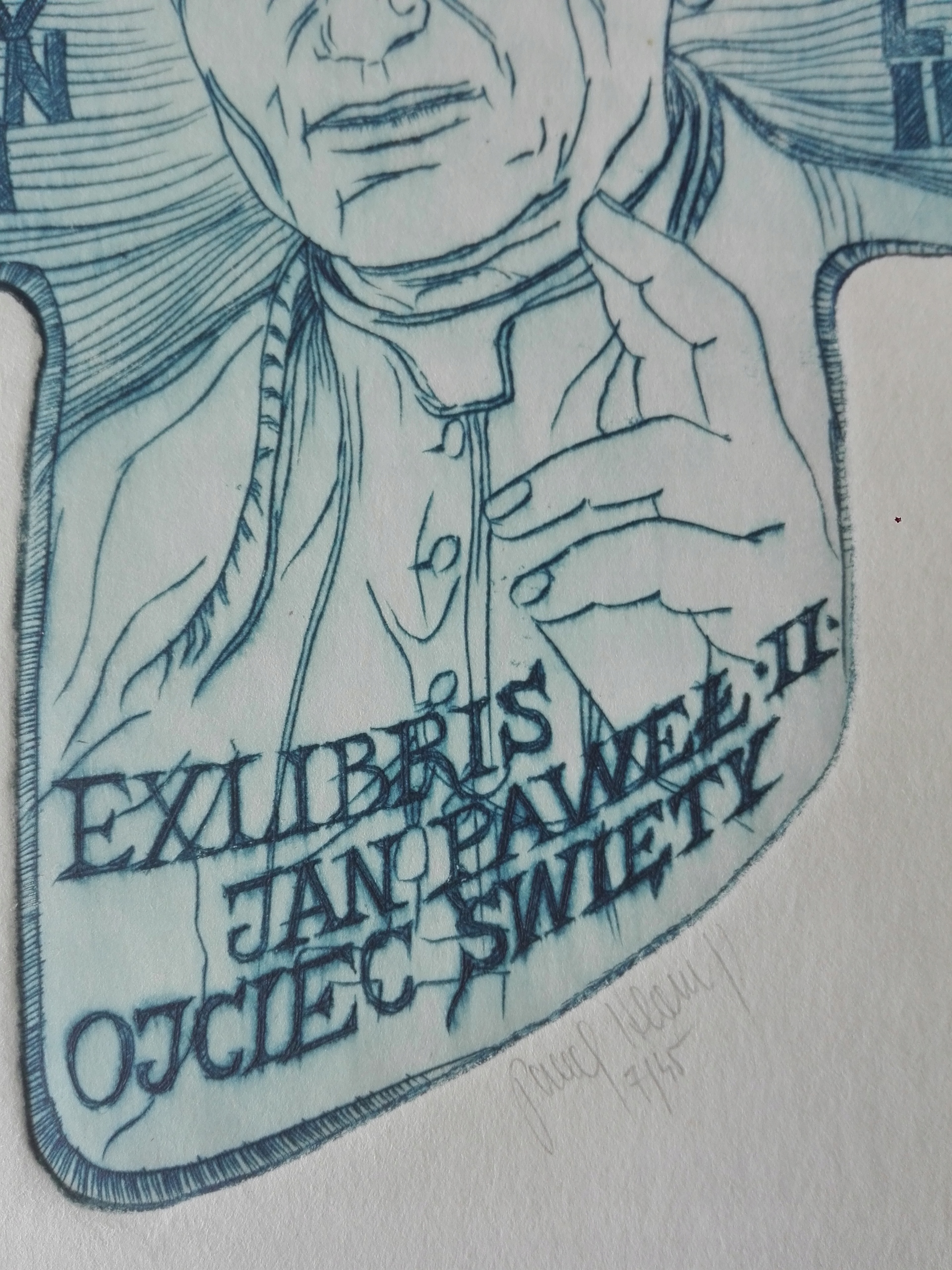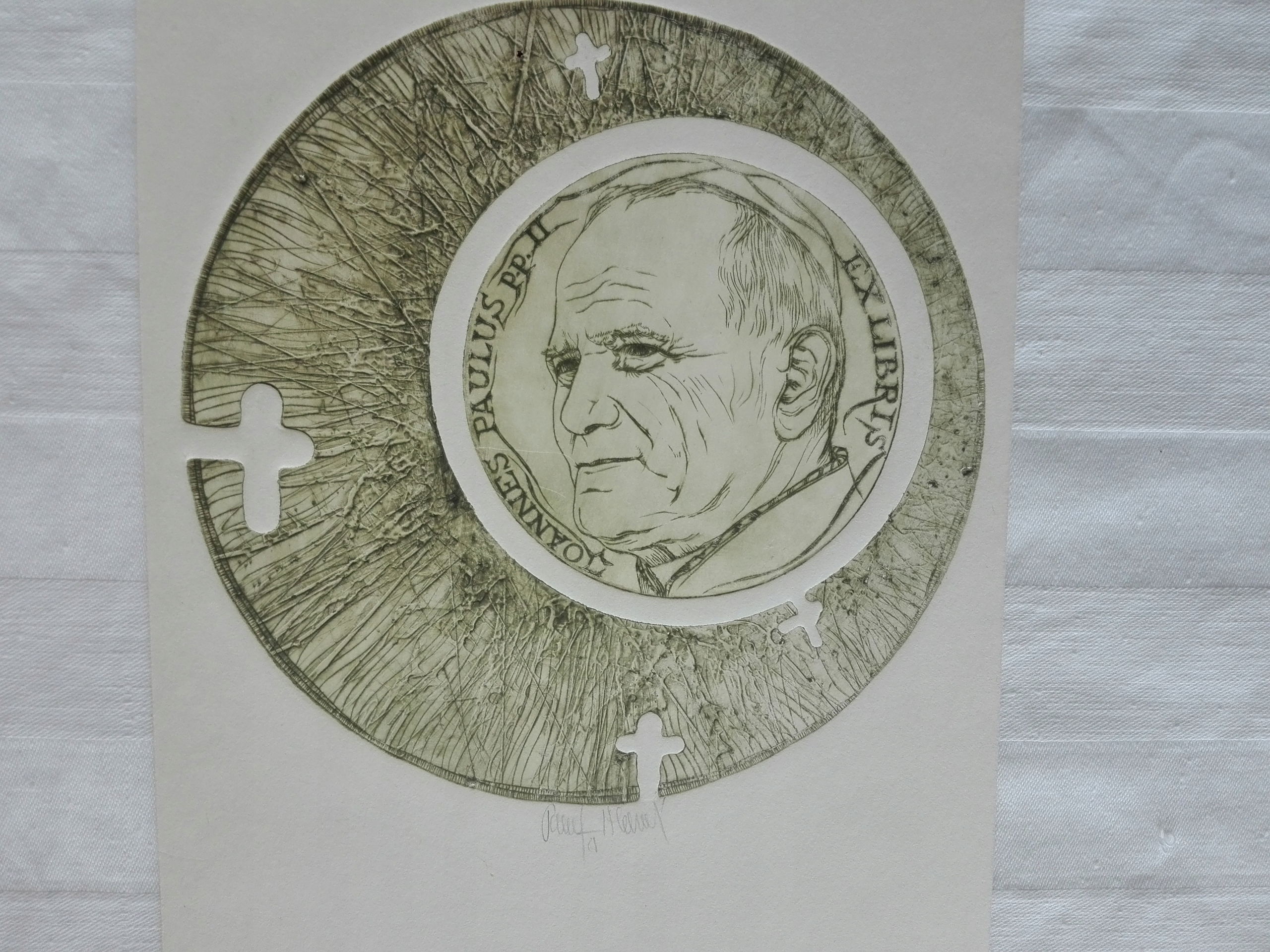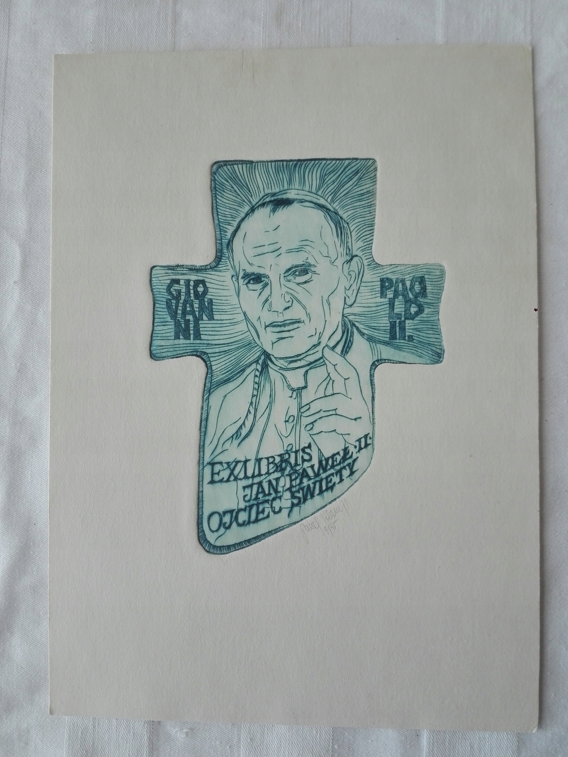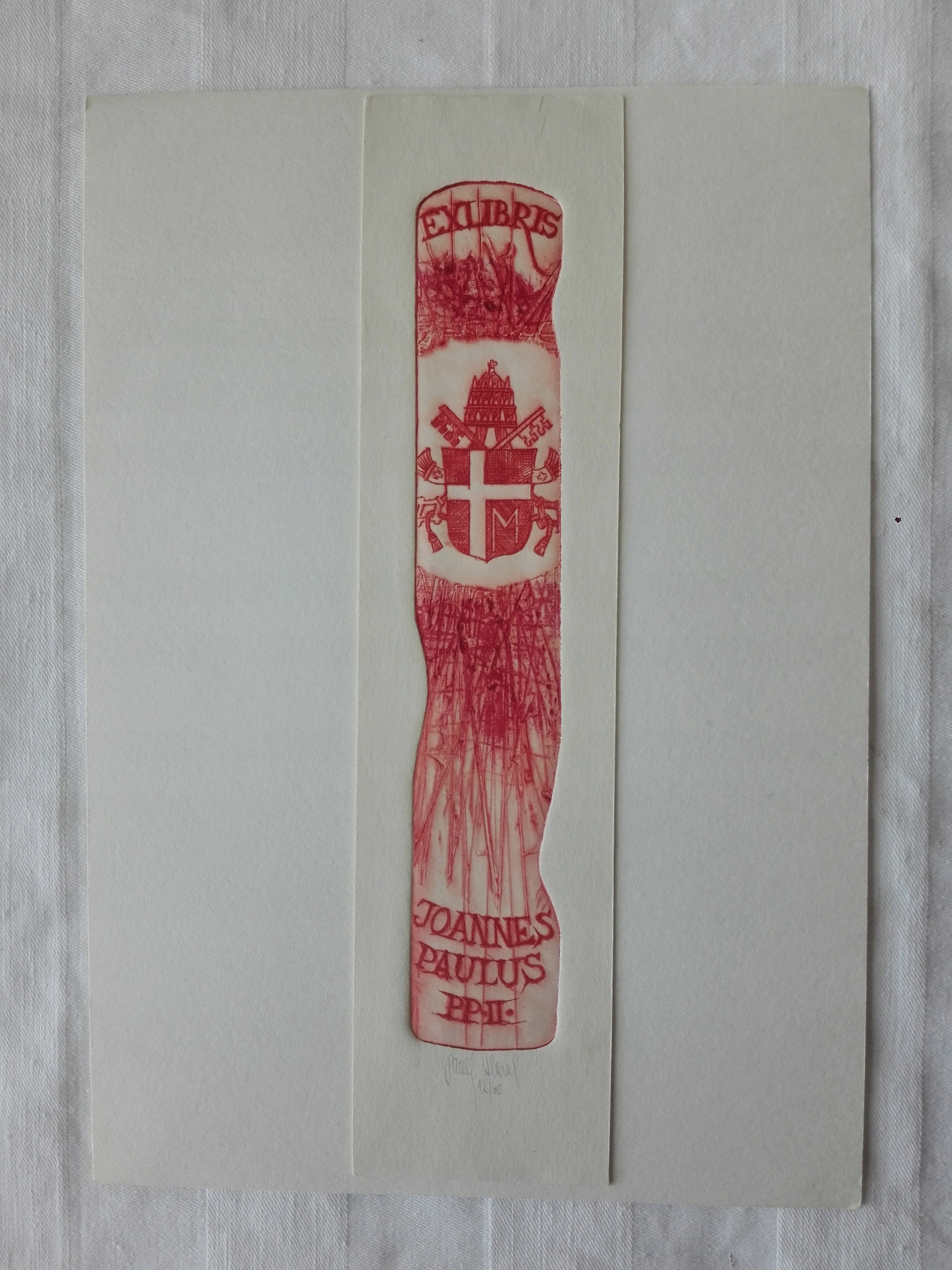 - Дуже рідкісний екслібрис, виготовлений чеським графіком і живописцем Павлом Главатим у 1981 році як книжковий знак Папи Івана Павла ІІ.