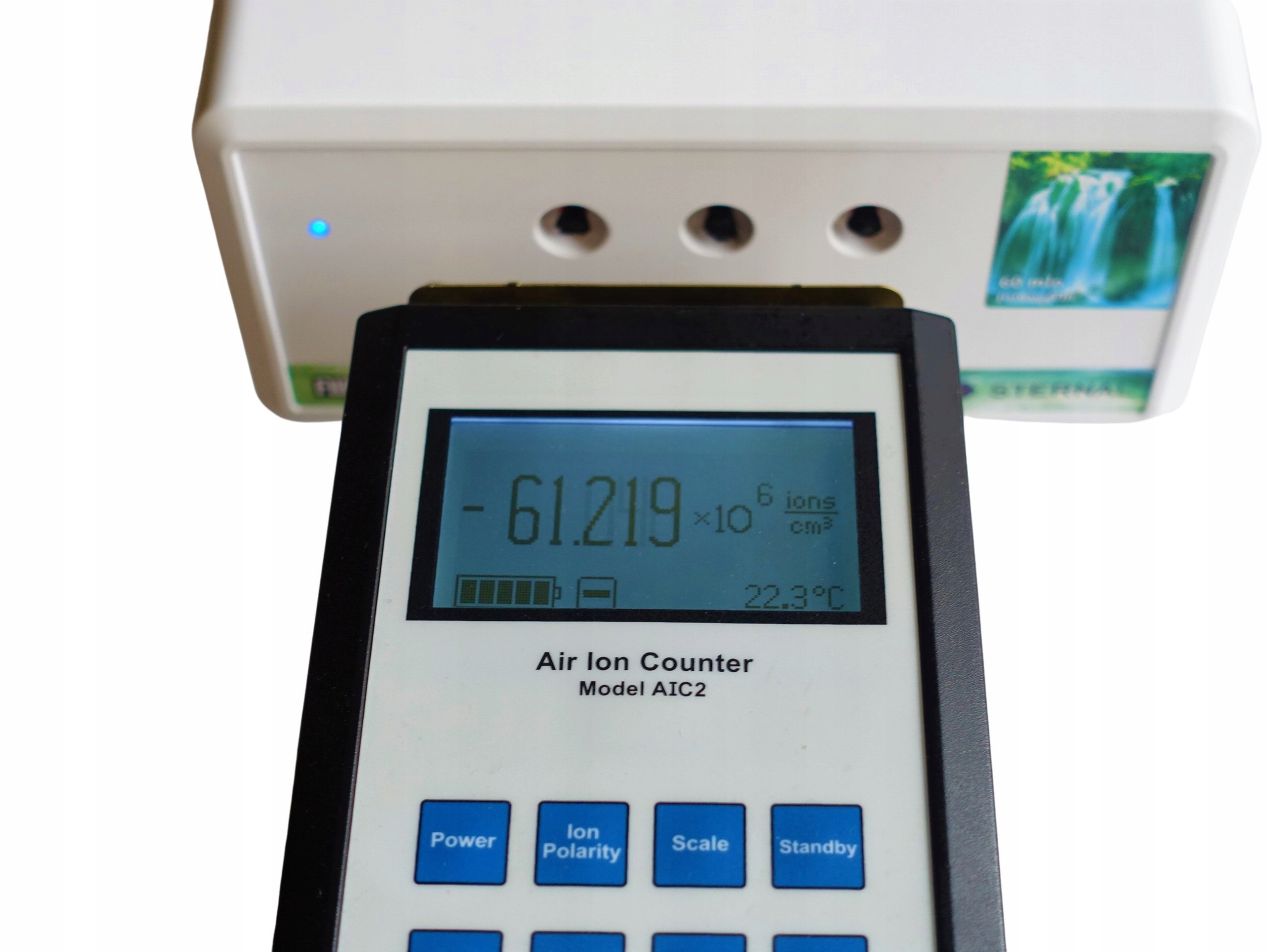 Фото праворуч показує вимірювання випромінювання негативних іонів 61,2 мільйона іонів/см3. p>