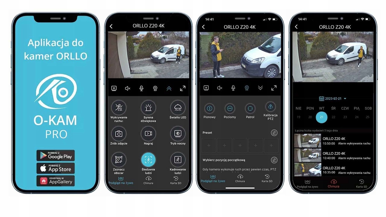 Orllo камери з серії з співпрацею з безкоштовним додатком O-kam pro -це програма для підтримки різних пристроїв інтелектуального будинку (не лише камер) багатьох виробників. Забезпечує просте та інтуїтивне обслуговування в польській мові.