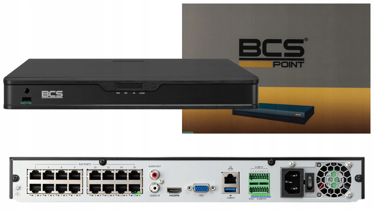 Реєстратор BCS Point забезпечує роботу до 16 IP-камер із максимальною роздільною здатністю 12 Мпікс. Запис на диски SATA до 10 ТБ. Реєстратор має аудіо вхід/вихід, входи сигналізації, порт RJ-45, 2 порти USB і виходи для монітора HDMI і VGA. Максимальна вхідна пропускна здатність 320 Мбіт/с, вихідна 160 Мбіт/с.