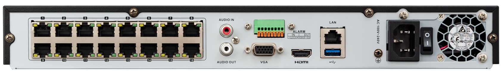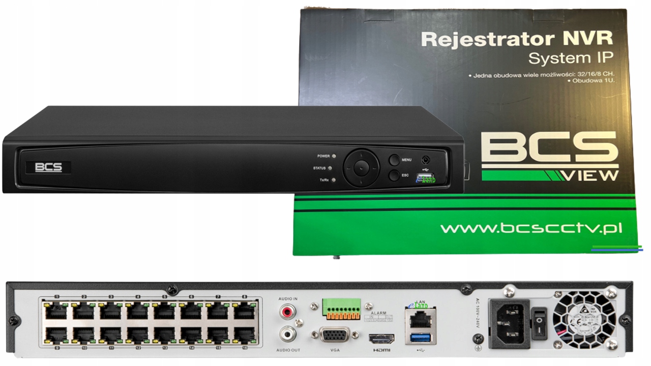 BCS Переглянути мережевий рекордер. Це дозволяє відображати та записувати до 16 IP -камер у максимальній роздільній здатності 12mpx. Запишіть на 2 диски SATA до 6 ТБ для кожного диска. Він має 1 вхід та 1 аудіовинук, 4 входи та 1 вихід тривоги, порт RJ-45, 2 USB-порти та HDMI 4K (3840x2160) та VGA (1920x1080) моніторинг виходи, що працюють незалежно. Максимальна вхідна смуга 160 Мбіт / с, вихідна 256 Мбіт / с. Рекордер підтримує розширені функції виявлення відео: виявлення руху, перетин лінійки, вторгнення в область. Він має побудований -16 порт -перемикач Poe 100 Мбіт / с 200 Вт.