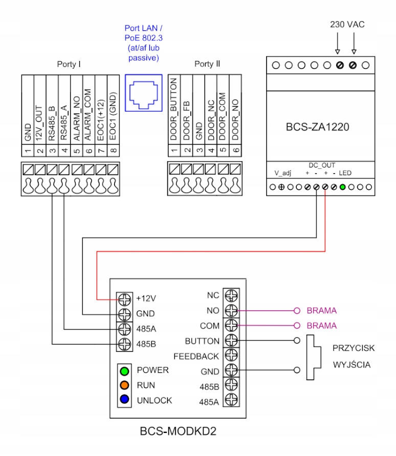 - Входи: 1x кнопка виходу (DOOR_BUTTON + GND); 1x вхід живлення (2wires-GND; 2wires-48V) - 2-провідний вхід шини (без полярності, передачі даних і живлення, лише для 2-провідних систем) на основі джерела живлення 48V DC (потрібен адаптер BCS-ADIP-II, з джерелом живлення). 1x геркон (DOOR_FB + GND), макс тільки модуль BCS-MODKD2; 1x вихід 12V (12V_OUT), необхідно забезпечити додаткове джерело живлення 12V DC для живлення: IP-системи: PoE (802.3af/af/passive): через 2-провідну шину, потрібне підключення адаптера BCS-ADIP-II разом з блоком живлення BCS-ZA4;