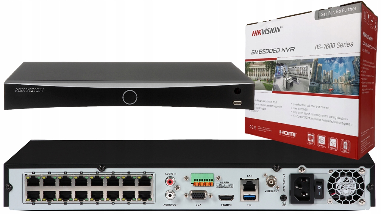 Реєстратор дозволяє записувати зображення з IP камери з роздільною здатністю до 12 Мпікс. Він має вбудований 16-to порт комутатор PoE, що забезпечує пряме підключення та живлення IP-камер. Незалежні виходи HDMI (роздільна здатність до 4K) і VGA (роздільна здатність до 1080p) дозволяють підключити два монітори. Вид на кожному виході можна налаштовувати незалежно, встановлювати різні поділки вікон і виводити на кожне з них зображення з будь-якої камери. 2 порти SATA дозволяють підключати жорсткі диски ємністю до 10 ТБ кожен. У разі переповнення пам'яті запускається автоматичний перезапис, щоб запобігти втраті останніх даних. Вбудовані порти USB дозволяють підключати флешку або зовнішній накопичувач і копіювати окремі фрагменти на зовнішні носії даних.
