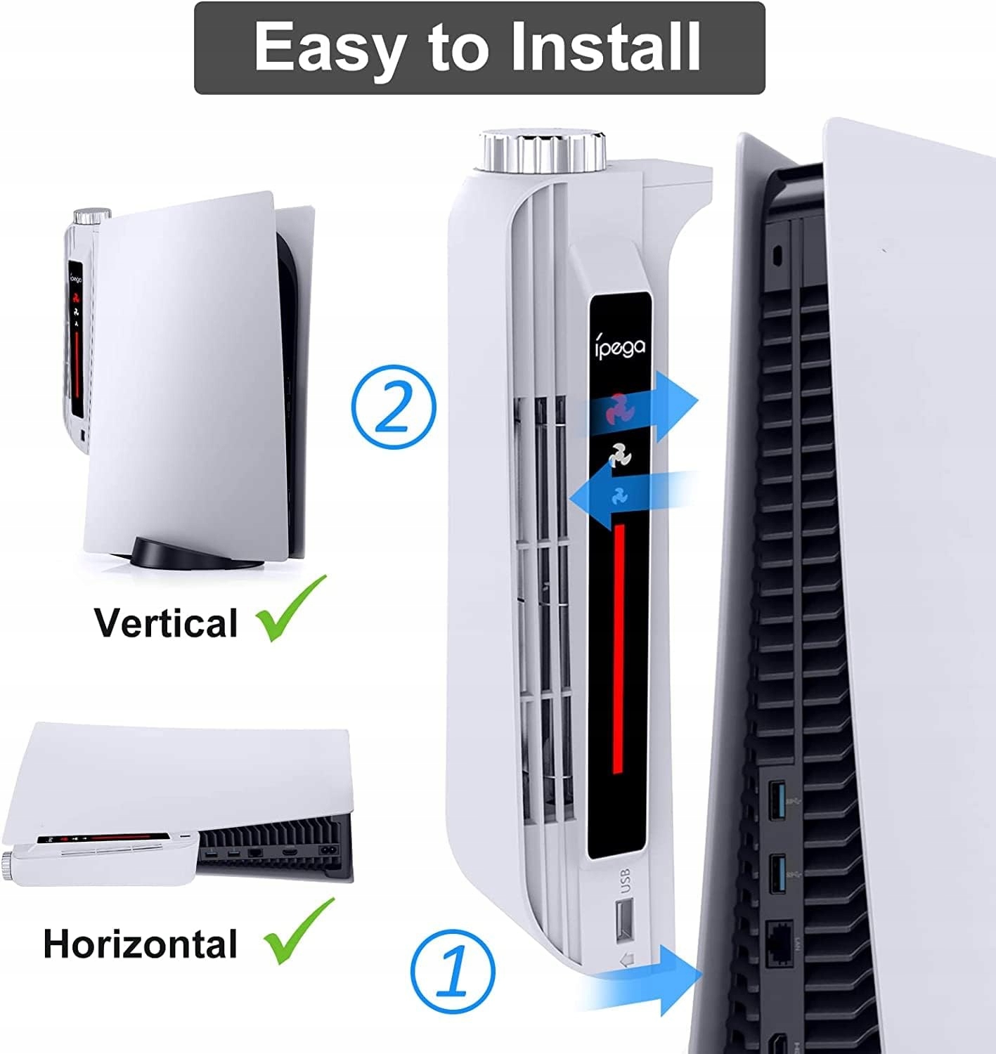 Легко в установці: простота - це завжди найкраще рішення. Просто покладіть вентилятор охолодження в USB -порт консолі PS5 і натисніть верхню частину вентилятора до консолі. Вертикальний або горизонтальний, залежно від ваших потреб, завжди варто вибрати вентилятор, який допоможе у розсіювання тепла.
