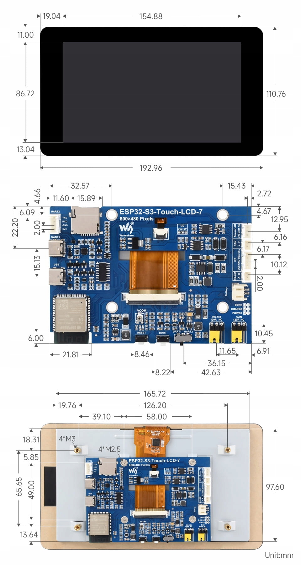 ESP32-S3-Touch-LCD-7 — це ефективна плата розробки з 7-дюймовим ємнісним екраном із роздільною здатністю 800×480 і 5-точковим дотиком. Оснащений Wi-Fi 2,4 ГГц, Bluetooth 5, 8 МБ флеш-пам’яті та PSRAM, він ідеально підходить для проектів IoT та HMI. Підтримує інтерфейси: CAN, I2C, RS485, Micro SD. Він має вбудовану систему зарядки акумулятора, порти USB і роз’єми GPIO для датчиків і периферійних пристроїв.