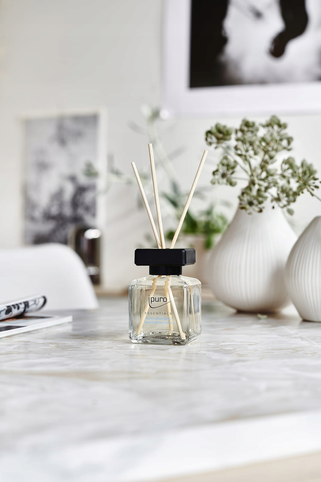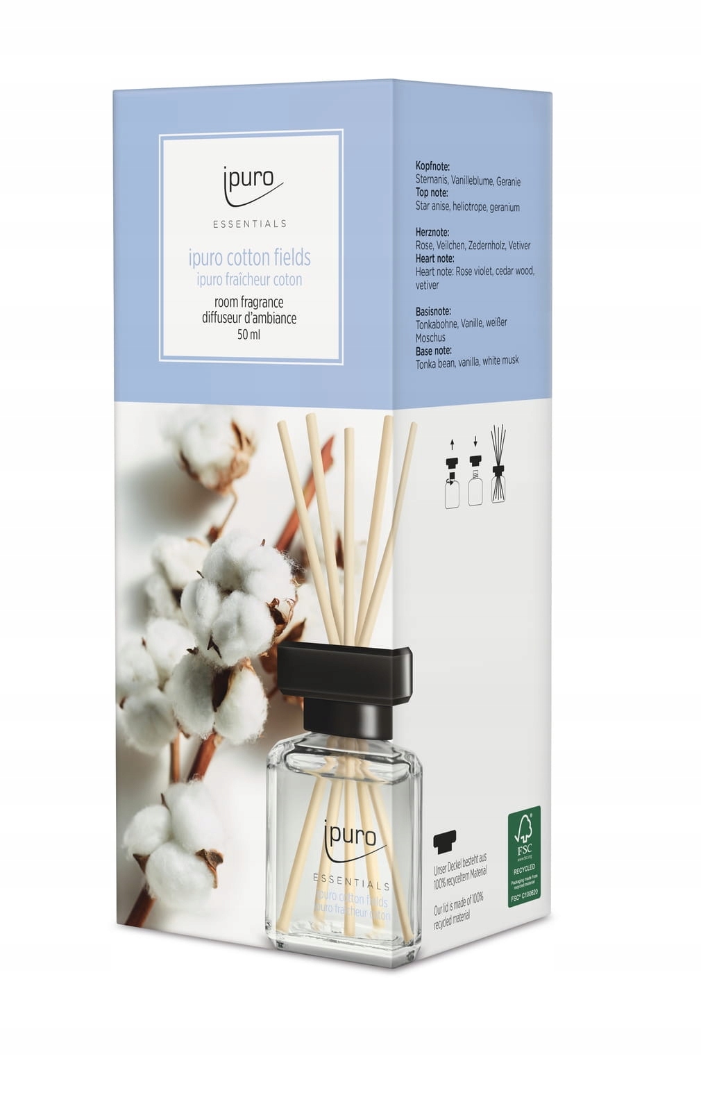 Дифузор аромату Ipuro із серії ESSENTIALS з унікальним ароматом Cotton Fields. Це чистий, тонкий і злегка пудровий аромат з ноткою ванілі - він створює затишну, домашню атмосферу в кімнаті. кімната.