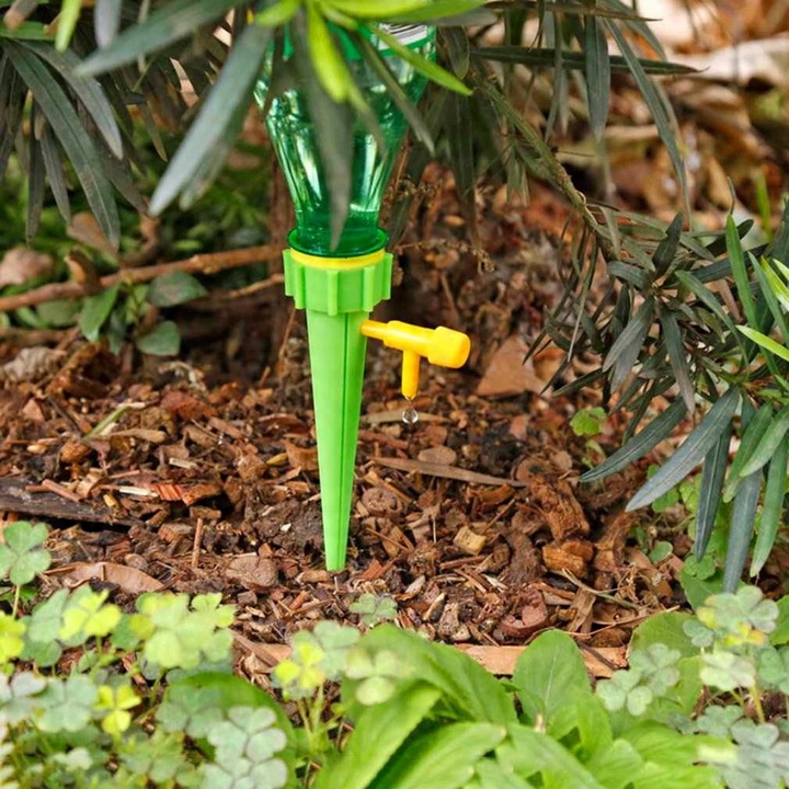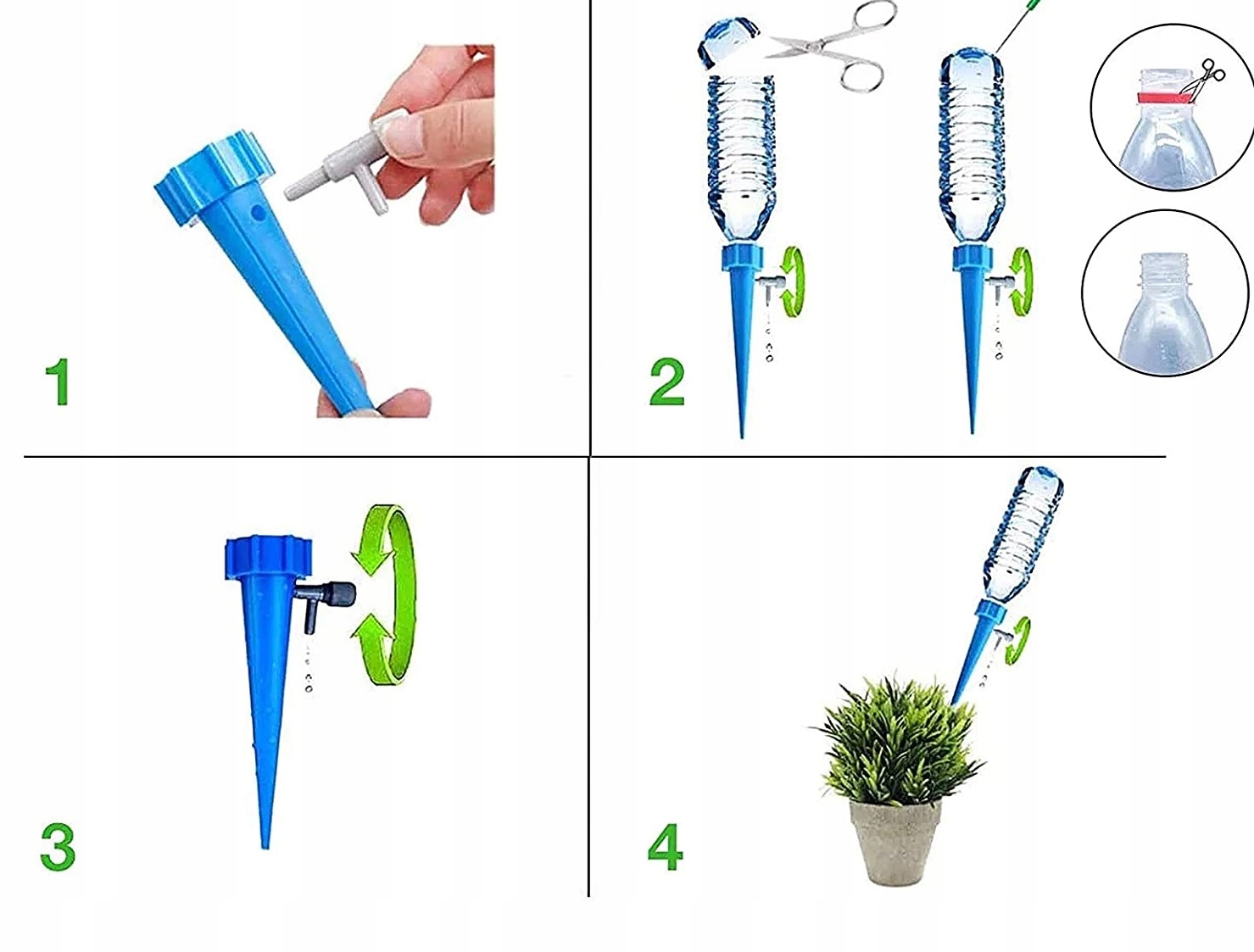 - ЛЕГКИЙ ВСТАНОВЛЕННЯ - дозвольте воді текти, відрізавши кінчик зрошувача; чим більше отвір, тим швидше буде текти вода. Потім прикріпіть зрошувач до обраної пляшки, наповненої водою, і встромте його в землю. Рекомендується використовувати темніші (або закриті) пляшки, щоб зменшити доступ світла до води, щоб уникнути росту водоростей і бактерій.