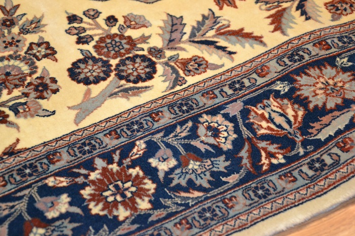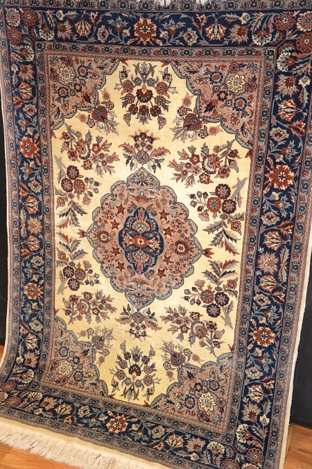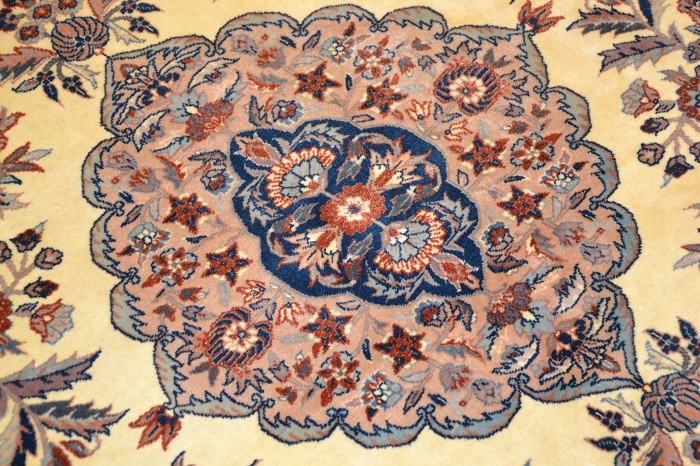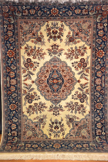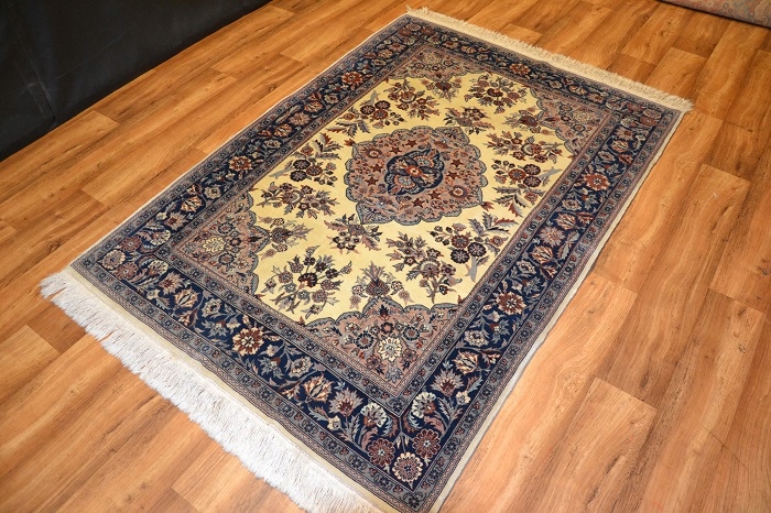 Висококласний і винятково красивий, оригінальний перський килим ISFAHAN - витканий вручну і виготовлений з високоякісної кашемірової вовни, підтвердженої сертифікатом якості та походження, з тонким кроєм, блискучим флісом. Східний дизайн (вражаючий медальйон, оточений чудовими квітковими композиціями) і гармонійно контрастні кольори роблять його надзвичайно красивим і гідним у розгорнутому вигляді.