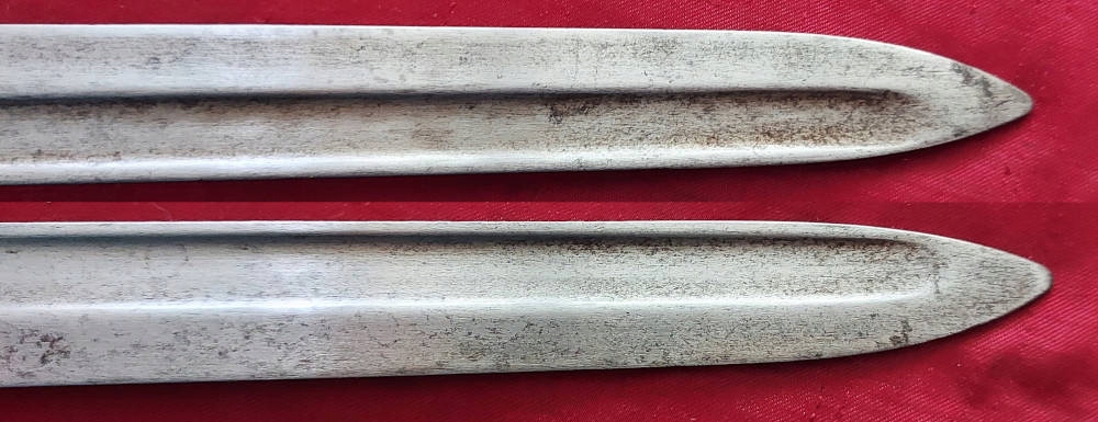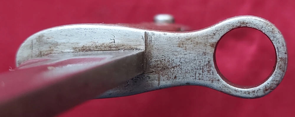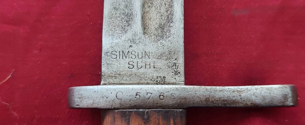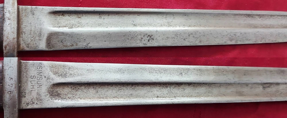 Копія, видна на фотографіях, добре збережена. Чорне лезо. На порозі леза Simson & Co Suhl . Число c 576 вражений Jelc. Обшивка ручки дерев’яна, оригінальна. Замок Bayonet функціональний.