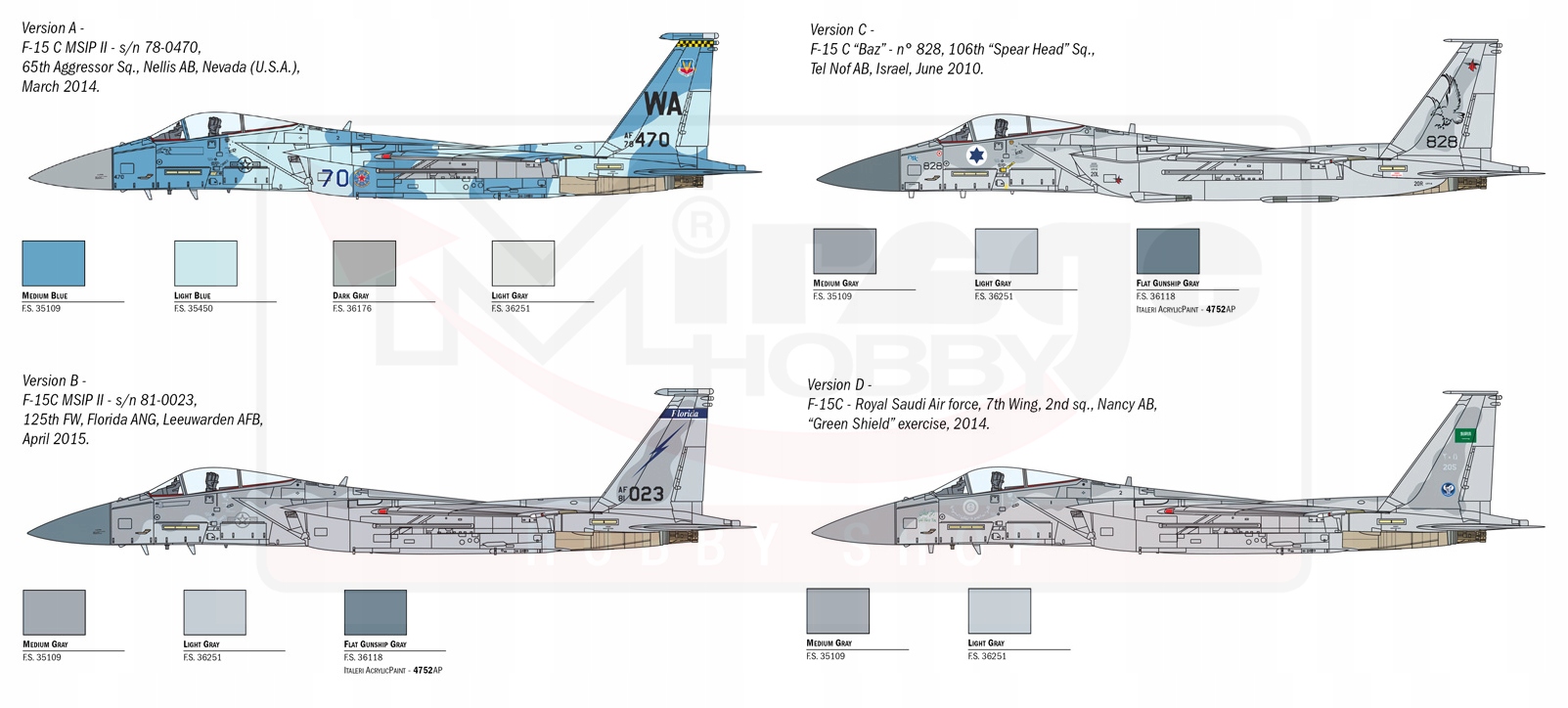 Mc Donnel Douglas F-15 — це одномісний американський всепогодний винищувач, призначений для завоювання й утримання переваги в повітрі. F-15 Eagle був розроблений у 1970-х роках, щоб забезпечити ВПС Сполучених Штатів сучасним і надзвичайно вдосконаленим винищувачем із дуже високими характеристиками. F-15C є більш сучасною версією і зараз в основному використовується ВПС США, Національною гвардією США, а також ВПС кількох країн, таких як Японія, Ізраїль і Саудівська Аравія. F-15 брав участь у війні в Перській затоці в 1991 році і зміг гарантувати перевагу в повітрі силам коаліції. Це був найефективніший винищувач із значною кількістю збитих літаків противника. Озброєний 20мм. Гармата M61 може використовувати широкий спектр ракет класу «повітря-повітря». Завдяки двом потужним турбовентиляторним двигунам Pratt & Whitney F-100 "Orzeł" здатний розвивати максимальну швидкість 2,5 Маха.