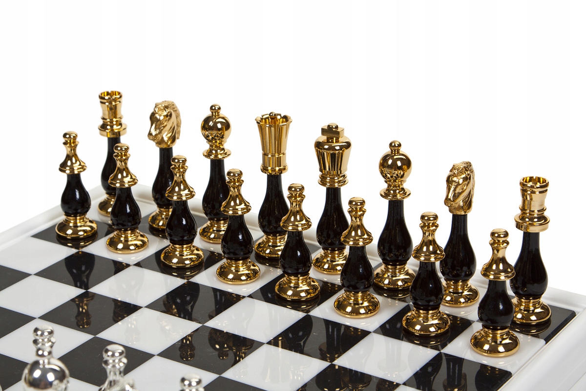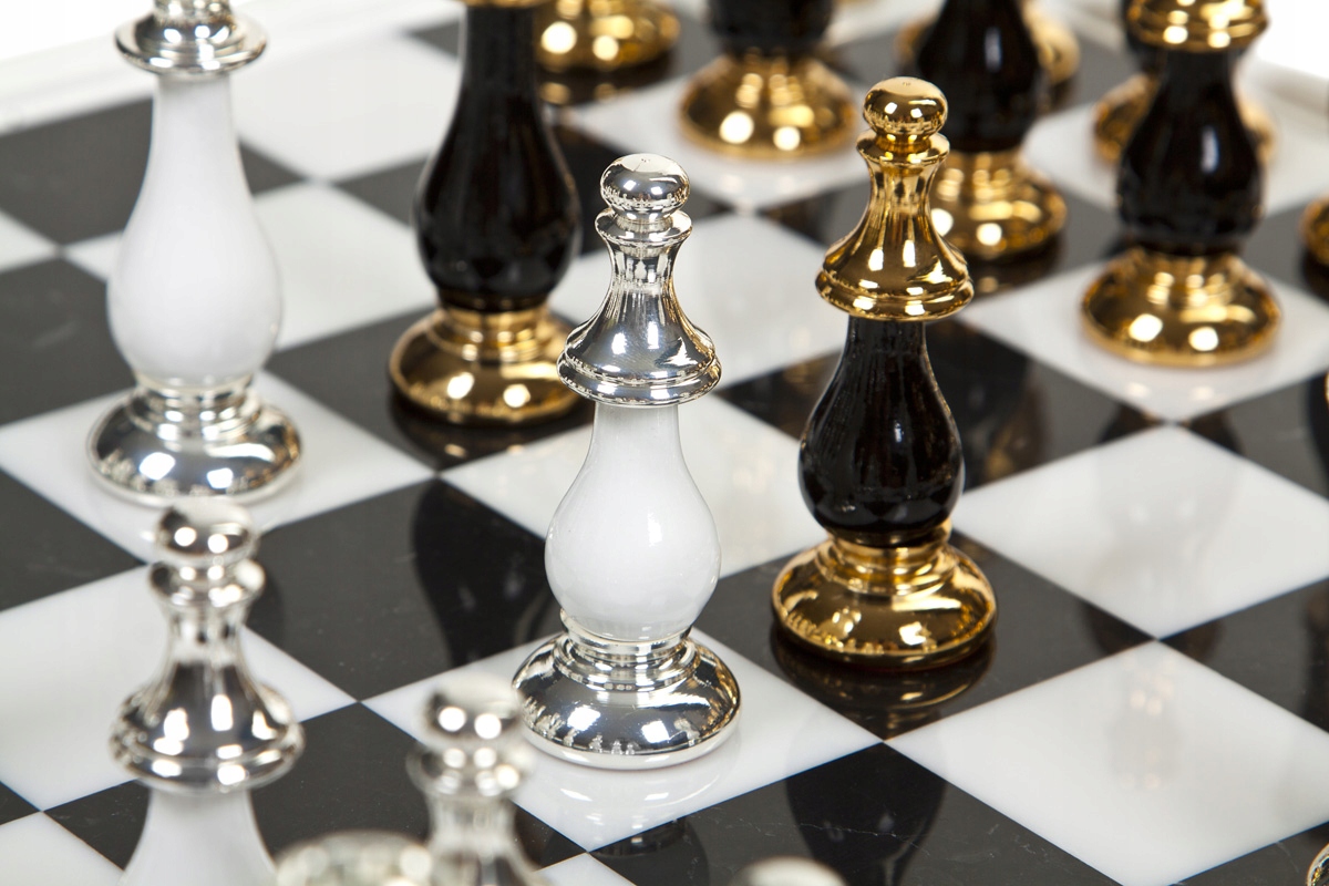 Шахи світу -відомий італійський бренд Italfama. Шахова дошка, виготовлена з дерева та мармуру, із висувною шухлядою для зберігання фігур. Розміри шахової дошки: 47 х 47 х 12 см, розмір поля: 4,5 см. Фігури, виготовлені з латуні, покриті золотом 24 к та 990 сріблом. Висота короля: 9,9 см - Ø База 2,9 см.