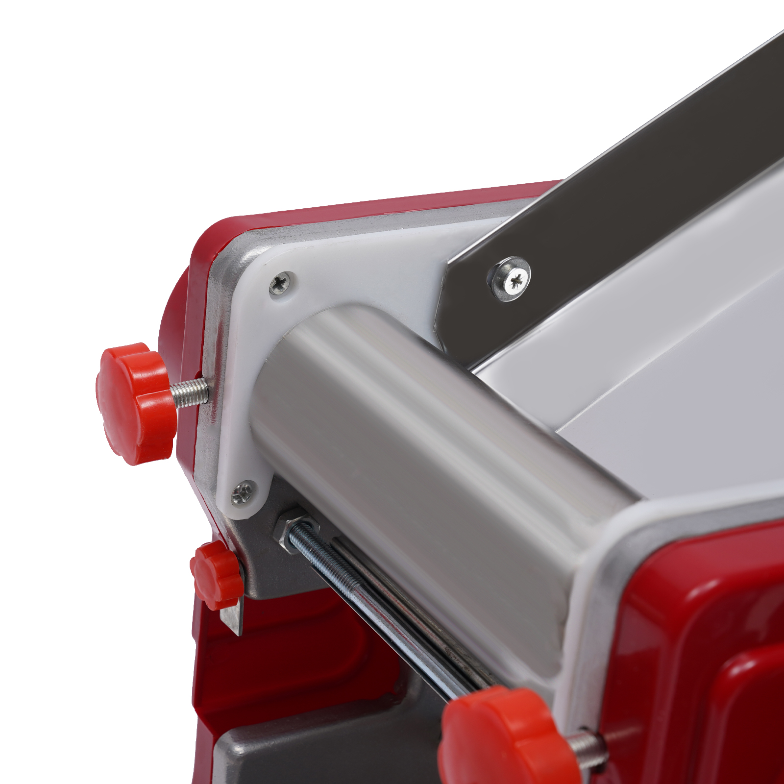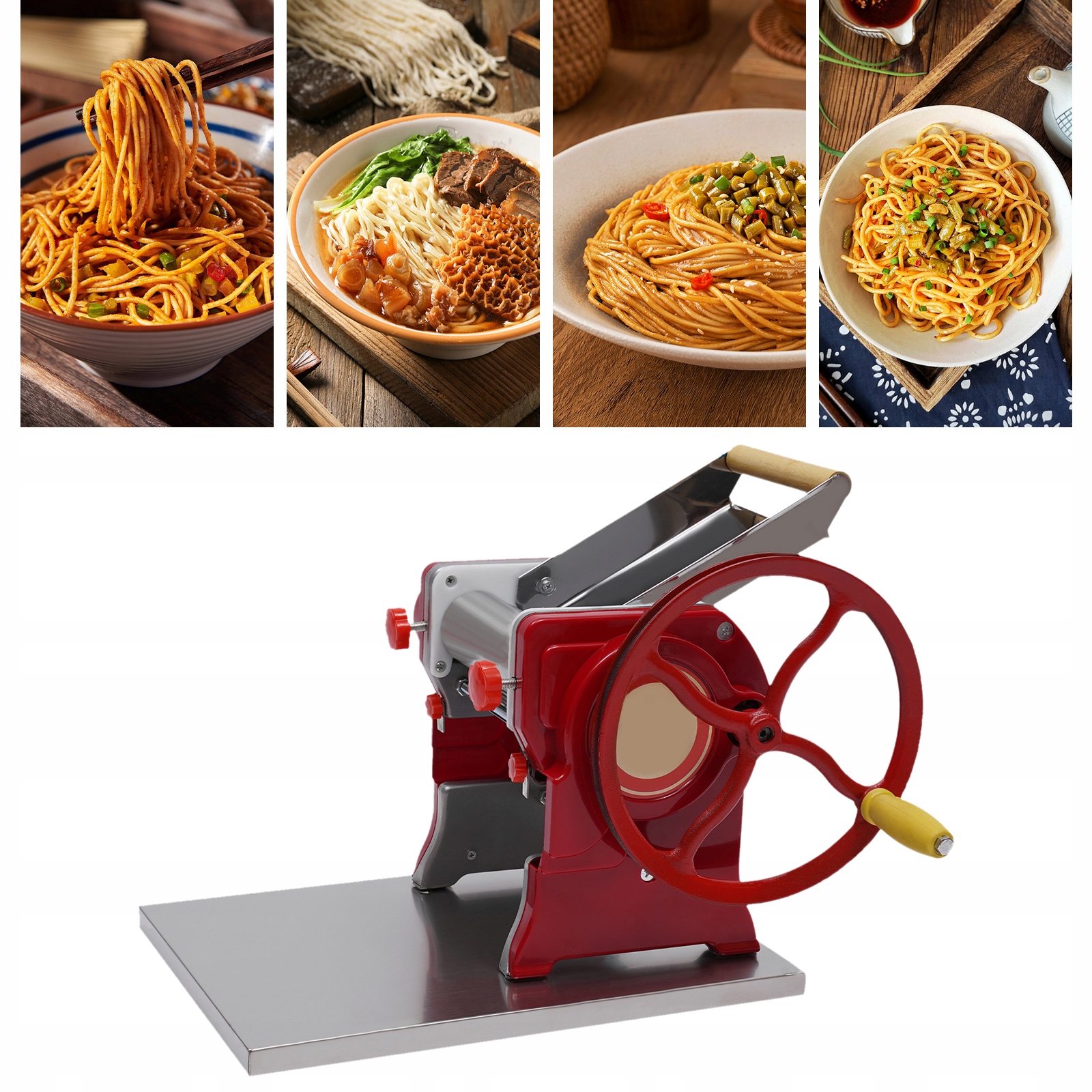 Ця ефективна машина для макаронних виробів виготовлена з міцної нержавіючої сталі та призначена для зручності використання. Корпус червоного кольору в поєднанні з жовтою ручкою виглядає стильно. Обертання ручки вручну дозволяє легко готувати макарони різної товщини, що ідеально підходить для домашньої пасти, пельменів тощо. Машина має стабільну структуру та легко миється, що робить її ідеальним вибором для домашніх кухонь і ресторанів.
